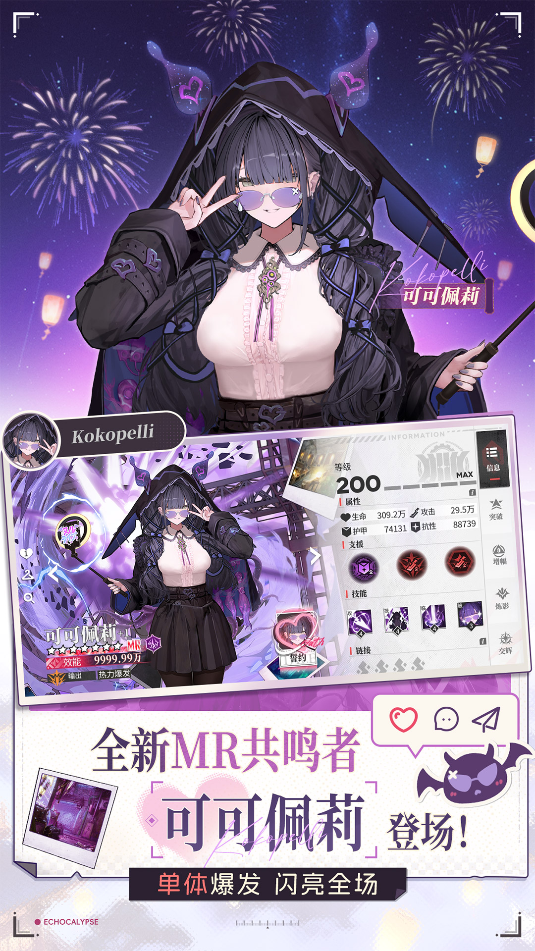 新岁祈晴<br>-元旦活动限时开启<br>-UR自选、全新共鸣者、活动奖励,超多福利等你拿<br>《绯色回响》元旦版本开启,登录即领UR自选!全新共鸣者,全新玩法,七日签到好礼拿不停!萌新入坑,老友回归,此刻正是好时机!<br><br>登录即领UR自选,超多福利送不停<br>强力UR共鸣者+专属共鸣武装自选登录即送!无论是新手组队还是老手补强,绝佳机会不要错过!更有元旦七日签到,圣诞祈愿抽签活动,元旦社区礼包等超多福利等着你!<br><br>MR共鸣者「可可佩莉」&「白英」上线<br>既是全能领域的人气网红,又是四面玲珑的情报人员,腹黑俏皮的「可可佩莉」欢迎你加入她的频道~雷属性热力爆发型MR共鸣者「可可佩莉」闪亮登场,专属时装「沉溺浸礼」同步上架。<br>归隐深山、清心济世,天然散漫的药师「白英」虽反应木讷,但待人行医认真不苟~水属性清心济世型MR共鸣者「白英」限时登场,专属时装「回春秘药」同步上架。<br><br>全新玩法「临界侵蚀」,MR卡池保底升级<br>“解开限制(UR)的共鸣者进一步解放自己的力量,进入到了接近失控堕落的临界状态(MR),临界状态的共鸣者需要元素锚点来保护自己的意志。”全新元素玩法「临界侵蚀」,击败回响宿体,解决共鸣者们的侵蚀症状!MR卡池机制迎来同步更新,小保底升级为至少UR品质!<br><br>缔结心动誓约,独享爱意时刻<br>每个少女都有独属于她的专属时刻,为她戴上戒指,换上纯白婚纱,缔结你们之间的永恒羁绊!高质量live2D,特殊触碰互动,专属誓约剧情,快来打造属于你和她的心动时刻!<br><br>魔女之间特殊玩法,交流互动畅谈情话<br>曾经与你心灵共鸣的伙伴,在未知力量的侵蚀下,化身成「魔女」,她们等待着你的拯救!独特的对话互动系统,为她们注入灵魂,更有专属剧情,特殊互动等你解锁!