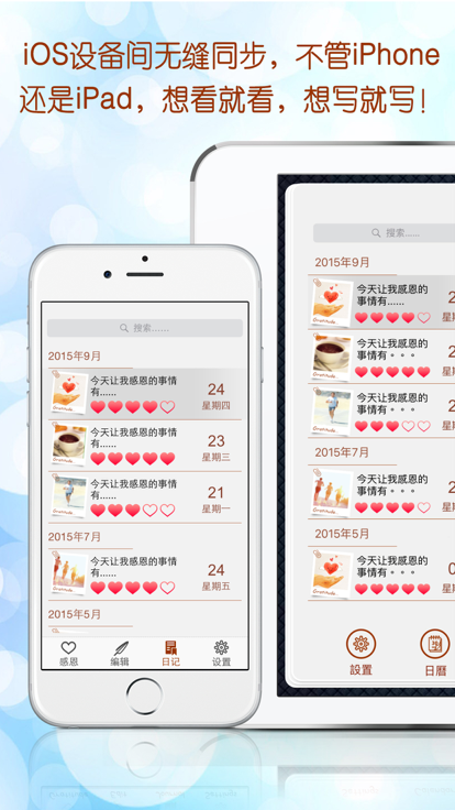 欧美市场感恩日志类排名第一的应用,专注感恩日志五年,为您提供最简单最极致的的日志体验。 娟娟细流汇成大海。记录每天让您感动、感恩的微小时刻,暖暖的正能量必将充满您的生活,让您每天怀着感恩的心体验生活之美,创造美好未来! 从今天起,开启您的感恩之旅!记录那些值得记录值得回味的美好时刻! 主要功能: --零干扰,专注、极致体验-- 界面设计简单易用,用户每天可写一篇日志(可添加多个条目),专注今天,感受今天,简单到极致也是一种美。 --个性化,可分享-- 您的感恩日志,自然应该体现您的风格。我们提供个性化背景和字体,让您的日志与众不同。美好的事物才值得分享,把您的感恩日志发布到社交媒体上去,感谢那些值得感谢的人和事! --条理清晰 一目了然-- 时光轴模式和日历模式共存。回味感恩日志如此简单! --云同步,无处不在-- 开启iCloud云服务,用任何iOS设备同步您的感恩日志,回味感恩时刻,暖暖情义涌上心头! --图片,传达文字之外的力量-- 图片有时能够传达文字之外的力量。支持最多插入三张照片,图文并茂,回味无穷!