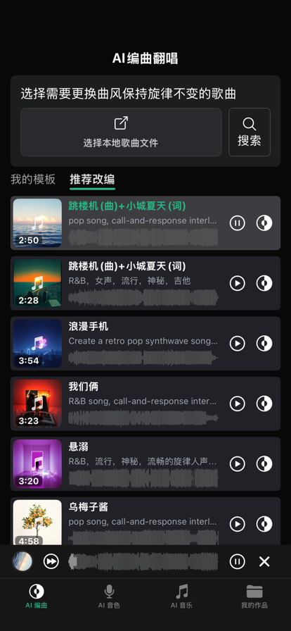 简单易用的一键AI翻唱,几分钟内生成AI翻唱,本地可以快速切换不同音色模型进行试听和免费生成导出到音乐文件,用户友好的界面简单易用。只需上传歌曲、选择声音,即可立即创作惊艳的AI翻唱。完美适合初学者和专业人士。 AI编曲翻唱,保留原曲旋律重新改编音乐风格,并支持自由改写歌词,轻松打造专属的全新版本。 使用先进AI技术创作录音室级别的AI翻唱作品。我们的精密声音音色模型确保自然的声音效果,可与专业录音媲美。完美适配音乐制作、视频内容和社交媒体分享。 提供多种AI音色模型创作独特的AI翻唱。从榜单艺人到网红和动漫角色。定期更新新声音,让你的翻唱保持新鲜感和吸引力。 创作各种流派的AI翻唱 - 流行、摇滚、嘻哈、乡村等。我们的AI翻唱生成器适应任何音乐风格,同时保持声音的真实性。完美适合尝试不同流派和风格。 通过内置的人声增强工具,支持对音调、音量、混响等参数进行灵活调节,用户可在本地实时试听并微调细节,从而打造出更具表现力和音质更佳的AI翻唱作品。 训练你自己的AI声音模型,创作独特翻唱。上传你的声音样本,让AI创建个性化音色模型。理想用于创作自己声音的翻唱或开发自定义角色声音。