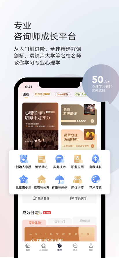 Hi,欢迎来到【咨询师之家】,超50万心理咨询师信赖的职业成长伙伴! 无论你是渴望入门的心理学爱好者,还是寻求个人成长与专业进阶的心理咨询师,这里都能为你提供从理论学习到就业发展的全方位支持,我们聚合顶尖师资与优质资源,帮你构建坚实的专业壁垒、培养强硬的个案能力! 【你能收获什么?】 #强大的师资团队 汇聚仇剑崟、张沛超等上百名国内外心理学大咖,带你深入学习CBT、精神分析、家庭治疗等流派,为您的心理咨询职业发展保驾护航; #从0到1的咨询师执业培训 联合百位心理学大师共同打磨,从“理论、实习、督导、入驻”四大版块,助力学员系统掌握心理咨询的理论知识与核心技能,培养能真正独立接待个案的心理咨询师; #专业心理督导支持 严选450余位资深督导师,提供专业的心理督导,帮你复盘咨询过程、探索咨询风格、解决执业困境,是咨询师职业生涯中不可或缺的支持; #大咖督导教学系列 连续7年更新!每年邀请张沛超等十余名资深大咖开展督导直播,你将能看到不同理论取向的大咖,如何解析真实个案、判断干预路径、平衡技术与伦理,这是提升临床实操能力的有效途径; #AI练习室 心理咨询技能实操工具,提供超500份的案例实操资源,覆盖共情、倾听、提问等咨询实战技术,你可以随时进行一场“真正的心理咨询”,帮你在与真实的来访者会面之前,打磨和提升咨询技能; #600+场大师课 累计800+小时的免费学习资源,周周直播!内容涉及焦虑抑郁等情绪管理、家庭关系、儿童青少年心理等多个维度,这是你进行免费学习、入门心理咨询领域的绝佳窗口; #咨询师专属交流社区 上千篇心理学实操干货等你阅读,万名助人者同行及大咖交流学习心得、分享执业经验。参与社区讨论和活动可赢取丰富实体奖励及积分,还可以在积分商城兑换心理学书籍、实物周边等福利,让你的成长更有价值! --- 咨询师之家,壹心理旗下专注于心理助人者成长与督导的一站式支持平台。 专注心理咨询成长,尽在咨询师之家,一站式满足您的学习、实践、交流需求。 联系我们: -微信公众号搜咨询师之家App,即可关注我们。 -或APP【我的->联系客服】联系我们
