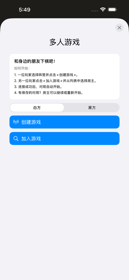 一黑一白两相争,妙趣横生五子棋! 先手要攻,后手要守。以攻为守,以守待攻。八卦易守,成角易攻。五子要点,次序在前。攻守博弈间错综复杂,烧脑无限! 界面清新优雅的五子棋游戏,操作简便、功能齐全,不仅有人机对战模式,还支持人人对战。是一款休闲益智必备的经典手游 游戏功能: 单机对弈,多种AI等级选择,支持挑战不同的电脑难度 双人PK,与好友来一局久违的棋盘厮杀 支持两种落子方式:放大落子和直接落子 持方选择:可选择黑棋或者白棋。黑棋为先手,白棋为后手 悔棋:一招不慎?你依然可以选择悔棋功能,挽救战局 随时随地分享你的战绩