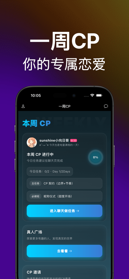 你的恋爱练习生计划,从AI到真人 一周CP,是一款为“想爱却不敢爱”的年轻人设计的社交成长应用。我们独创了AI试炼+真人广场双模式,让你不再因社交恐惧而错过缘分。 在这里,你可以先和AI练习聊天技巧,克服尴尬与紧张;等信心攒够了,再去真人广场遇见真实的TA。用一周时间,完成从恋爱新手到勇敢追爱者的蜕变。 【双核玩法,进阶式交友】 【第一阶段:AI试炼场】 不敢开口?不知道聊什么?先来和AI练练手! AI恋爱陪练:智能AI模拟真实异性对话,陪你练习开场白、接话题、化解尴尬 情景模拟:从初次破冰到深度交流,AI提供多种恋爱场景供你演练 实时反馈:AI会分析你的聊天节奏,给出优化建议,帮你越练越自信 零压力社交:说错话没关系,AI不会拒绝你,这里是绝对安全的练习场 【第二阶段:真人广场】 练习够了,是时候实战了! 真人真实认证:真人用户实时在线,资料真实可信 兴趣标签匹配:根据你在AI练习中展现的偏好,推荐兴趣相投的真人CP 从练习到实战:把在AI试炼场练过的套路,用在真实相遇里,成功率翻倍 【核心功能】 智能AI陪练系统:独家研发的恋爱AI,支持多轮深度对话,陪你从社恐练成社交达人 真人广场动态:浏览真实用户的日常动态,点赞评论,轻松开启话题 双向选择机制:互相喜欢才能聊天,拒绝骚扰,保护你的每一次心动 纯净交友环境:严格审核机制,拒绝广告,只留真心交友的人 【为什么要选择一周CP?】 “不是不想恋爱,是真的不知道该怎么开始。” 一周CP,为每一个在爱情面前犹豫的人,搭建了一座从胆怯到勇敢的桥梁。先练习,再出发。让AI陪你成长,让真人见证你的蜕变。 给自己一周时间,从AI试炼到真人相遇。 如有任何疑问,可以加入QQ客服群:765895033 【尊贵VIP自动订阅服务说明】 1.订阅周期:一个月(连续包月) 2.订阅价格:28元/月 3.付款:用户确认购买并付款后记入iTunes账户 4.自动续订:苹果iTunes账户会在到期前24小时内扣款,扣款成功后订阅周期顺延一定时间 5.取消续订: 如需取消订阅,请手动打开iOS的“设置” -->进入“iTunes Store 与 App Store”-->点击“Apple ID”,选择"查看Apple ID",进入"账户设置"页面,点击“订阅”,选择“一周CP”取消订阅即可。如未在订阅期结束的至少24小时前关闭订阅,此订阅将会自动续订。 6.尊贵VIP订阅服务协议:https://heliaoapp.xyz/brainhole/subscription 7.用户协议:https://heliaoapp.xyz/brainhole/agreement 8.隐私协议:https://heliaoapp.xyz/brainhole/privacy