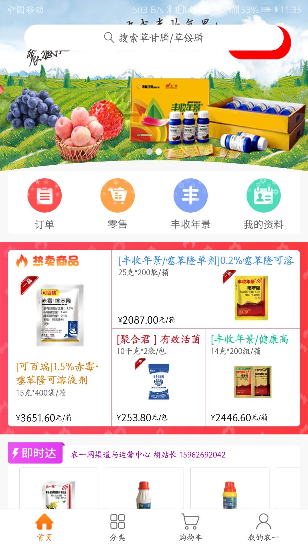 ----关于我们-----<br>农一网是由中国农药应用与发展协会发起,联合辉丰股份等国内多家农资生产与经营企业共同成立,服务于农资零售商和种植大户的垂直专业电商平台。<br><br>-----农资电商-----<br>采取平台+县域工作站+乡村代购员三级模式,与行业200强知名生产企业强强联合,确保产品质量,共同强化品牌优势。以农药为切入点,逐步向肥料、农机具、种子等农资品类延伸,为农资零售商、种植大户等提供一站式农资采购服务。<br><br>-----我们的成绩-----<br>农一网自2014年11月上线以来,累计发展县域工作站到800余家,注册代购员超5万名,累计销售额突破10亿,服务区域覆盖了国内70%的农业种植区,为数以千万计的农户提供了正品低价的农资产品。<br><br>-----联系方式-----<br>官方网站:www.16899.com<br>微信公众号:农一网(nongyi16899)<br>qq客服:3063038005<br>qq群:255271262<br>农一网客户端:在线客服