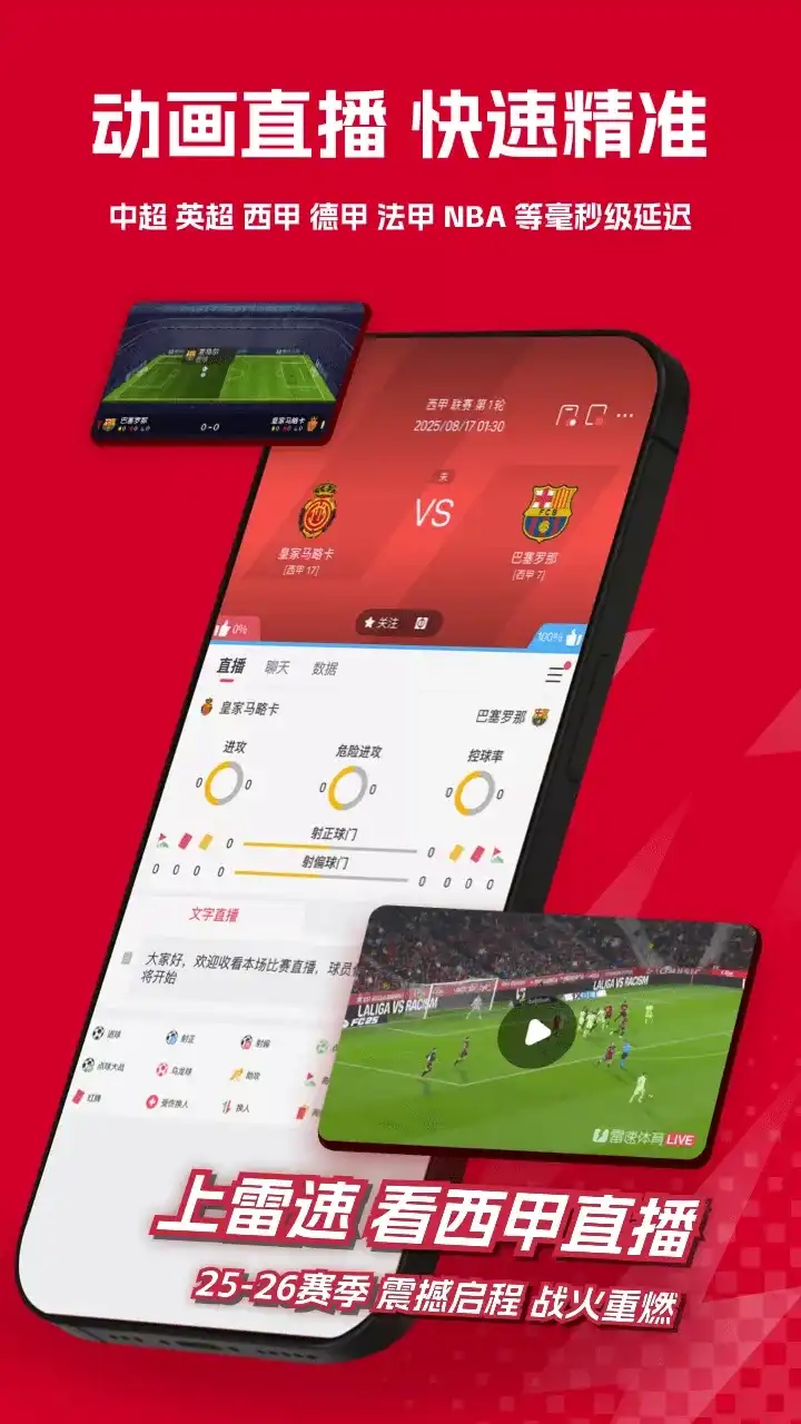 雷速体育--千万体育用户的共同选择。 雷速体育覆盖全球3000+不同体育赛事。为广大足球、篮球、网球、电竞爱好者提供精准的赛事信息、赛事直播、赛事资讯等服务。 为什么选择我们? 【足球赛事直播】涵盖西甲、韩K1、足协杯、中甲、澳超、德乙等足球体育赛事直播,实时了解赛事信息 【足篮网电竞赛事】覆盖全球3000+足球篮球网球等不同赛事,包含:欧冠杯、亚冠杯、中超、英超、西甲、德甲、意甲、法甲、日职联、韩K联、澳超、NBA、CBA、LOL、DOTA2等赛事,满足不同类型体育、电竞爱好者 【全球体育资讯】全球体坛热门信息一手拿握。足坛大事、NBA 战报、突发新闻、比赛战报、战术分析,这里有与体育有关的一切资讯 【动画直播】准确即时还原赛场战况的动画直播、快速精准的战报集锦,会在场上局势改变后,及时告诉你所钟爱球队和关注比赛的赛况,让你不错过每一场精彩比赛 【足篮资料库】供用户查询各类球队、球员、赛事资料,来这里查询你喜爱的球队、球员的资料吧