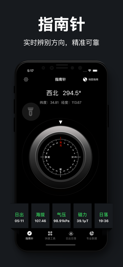 一款专业的指南针,户外旅行、野外探险的必备神器,其中包含了户外可能使用到的各种实用工具! 内存小,低耗电,有手电筒、常规指南针、地图指南功能,有经纬度、有全年日出日落时间表、提供寻星罗盘指南针、有海拔朝向、磁场气压、空气质量、环境参数的专业数据! 方便您更便捷的了解所处地理位置情况,让您不再迷失方向,带给您准确的定位和方向感!
