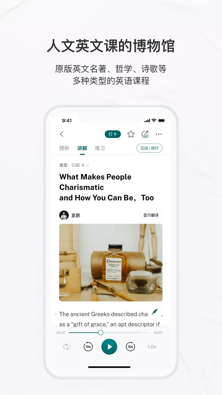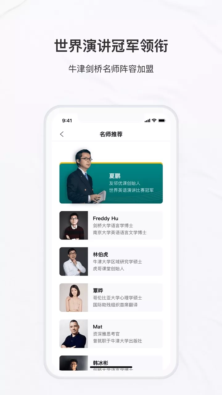 友邻优课,国内领先的在线英语知识付费平台。以“人文英语”为核心理念。友邻优课倡导“学无用的英文,做自由的灵魂”,以新闻报刊、人文经典、畅销书籍等作为素材,带领用户在精进英语技能的同时,睁眼看世界。 【专业内容团队】 内容策划:前China Daily资深记者:韩冰彬 学术顾问:剑桥大学现代及中世纪语言学院院长、上海外国语大学教授等 外教朗读:英美专业配音演员 【课程优势】 课程匠心铸:用10年时间,共计10万小时的人文英语课程 丰富的课程体系:为英文原版书籍、外媒新闻、哲学、经典诗歌等作为讲解材料 和高手一起学英文:“世界英语演讲比赛冠军”夏鹏、“剑桥大学语言学博士”Freddy Hu、“哥伦比亚大学认知心理学硕士”覃晔、“央视纪录片专业配音员”Jimmy、“资深雅思考官”Mat等 【课程内容】 课程共400+,热门课程如下: 时事:《每日外刊精读》、《友邻圆桌谈》 名著:《剧读莎士比亚》、《爱默生散文句读》、《经典名篇选读》 人物: 《莫奈:光与影的守望者》、《莫扎特:音乐神童的曲折人生》、《霍金简史》 心理:《品读 Mindfulness》、《友邻单向历日读》、《职场幸福哲学 · 发现你的优势》 口语:《从零开始学美/英音》、《提升双语能力》、《生活口语指南》 写作:《单读》非虚构写作、《英文论文写作》、《写好英文邮件/简历》、《跟CEO学商务写作》 哲学:《中国哲学简史》、《文明的碎片II》、《柏拉图 | 西方哲学家》、《论语里的英语》、《文明的碎片》 商业:《创业的真相》、《商业制霸手册》、《上瘾 Hooked》、《夏鹏 · 商业思维26讲》、《大企业背后的商道》 方法:《友邻方法论小课堂》、《专家教授谈英语学习》、《暴虐英语学习法》 旅行:《出国不犯二》、《泰国旅行指南》、《旅行漫游指南》 【大咖另荐】 俞敏洪--新东方创始人/洪泰基金联合创始人 他推荐道:友邻优课的课程让更多人在忙碌的生活之余看到文学的力量,找到心灵的宁静。我很欣慰,大力支持。 希望你也能和我一起支持,支持这一份勇气和执着。 冯唐--作家、医科博士/前麦肯锡合伙人 他推荐道:英美文学经典在华语世界里面传播有限,“友邻优课”的课程一直在努力打破这道鸿沟。穿越古今,东西合璧,直率不拧巴,坦诚接地气。 【如有问题】 微信搜索“youlinyouke”,关注官方公众号“友邻优课”,点击下方“联系我们-客服中心”。 或者拨打友邻客服中心电话:010-62565909,工作时间:10:00-19:00(工作日)。