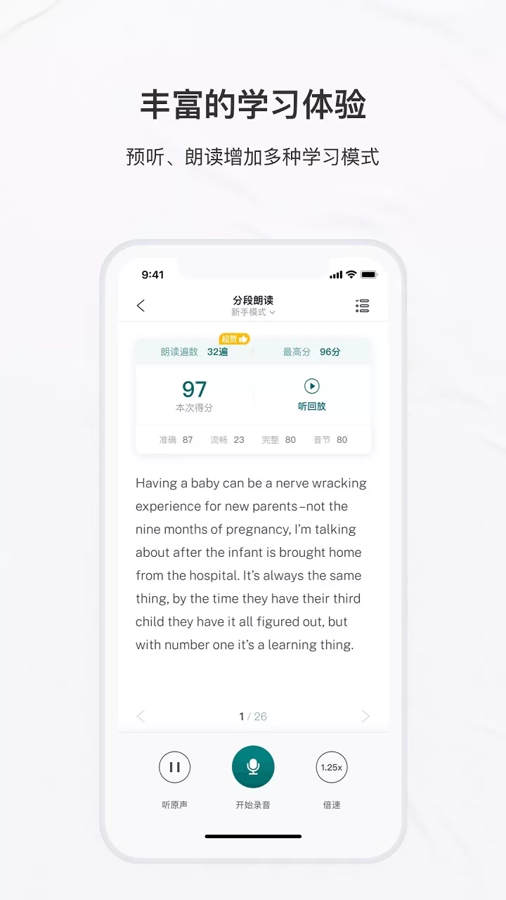 “流利说®英语”是一款好玩又有效的英语口语学习软件,让你“忍不住开口说英语”! 【“懂你英语®A⁺”核心课程】 自适应诊断测试,精准评估英语水平。AI 老师全程评估学习情况,根据优势和薄弱点智能调整学习节奏。课程专业系统,注重实际听说。 【有趣的配音课程】 配音课升级回归,新增海量视频片段!分为青春、搞笑、影视、爱情、科技等14个分类,给到同学们全面的配音体验。 【系统的内容编排】 每日更新地道实用的英语对话,带动口语、单词、语法、听力、阅读等能力的全面提升。 【丰富的学习素材】 课程内容贴近生活,覆盖日常会话、商务职场、旅游出行、校园生活等各类场景。 【真人语伴互动学习】 真人在线对话:根据等级匹配合适的语伴,展开英语互动对话;答题pk:连线小伙伴比拼单词量和英语知识! 【会打分的口语外教】 内置来自硅谷前沿语音识别技术,给你的英语口语实时打分,矫正发音。 【联系我们】 微信:公众号搜索“流利说” 隐私与使用协议: http://hybrid.liulishuo.com/lingome/shared_page.html#/terms 用户服务协议:https://lingome.liulishuo.com/user_service_agreement 隐私政策协议:https://lingome.liulishuo.com/user_policy
