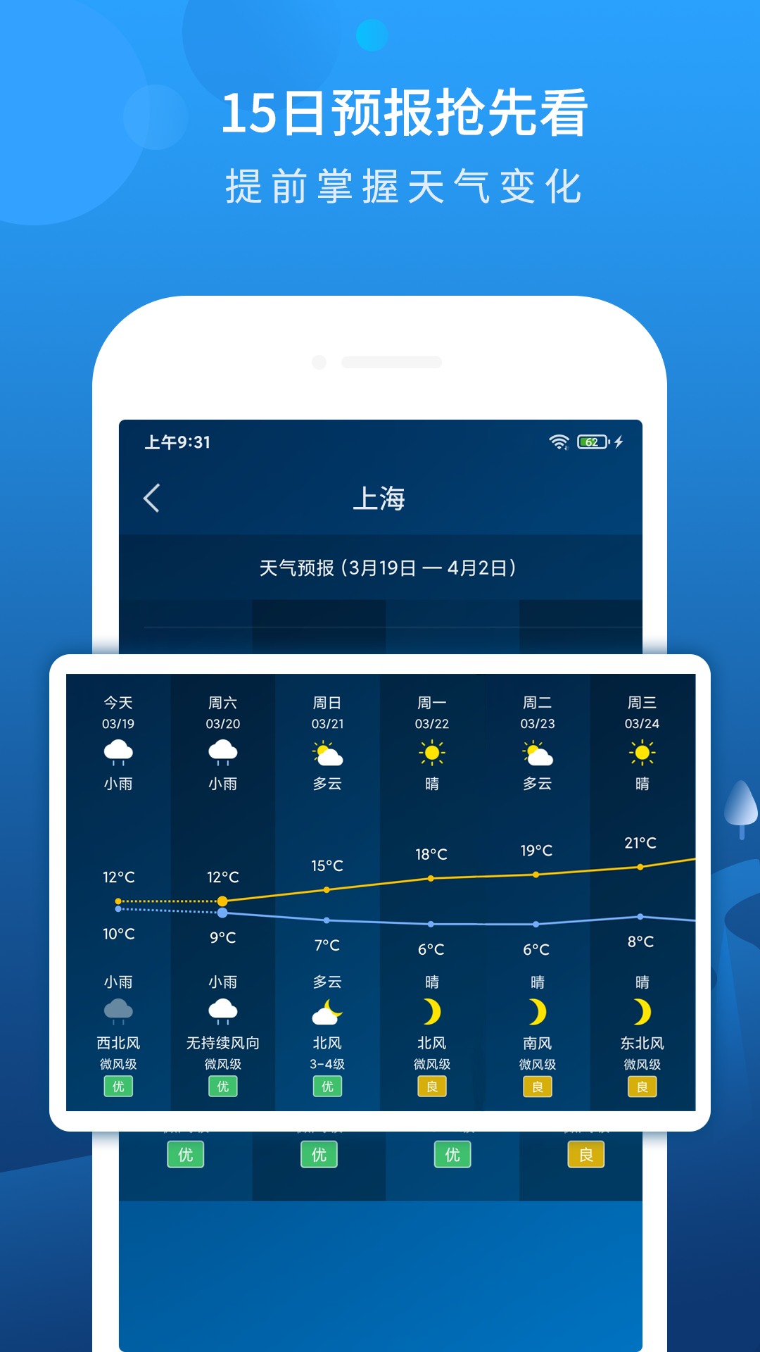 一款简洁清新的天气预报软件,可查看全国主要城市的天气信息。包含了全国3000多个县市的实时空气质量指数;并加入雾霾预警和语音播报天气实况。高精度的天气效果,实时的天气数据熟悉,全新的UI设计,高品质的体验。天气主页详细的天气数据、人性化的操作体验,让您随时随地知晓最近天气详情,可查询未来十五日天气预报和生活指数,让您轻易的掌控近期温度变化,便于及时增减衣物,轻轻松松享受生活。 <br>**特色功能** <br>空气质量——涵盖3162个县市的实时空气质量指数;并加入5天雾霾预报。 <br>实况背景——阴晴雨雪的城市风景,匹配实时天气状况,给您更直观的天气呈现。 <br>预报信息——实时天气及温度预报;未来天气信息及趋势对比;支持2486个县地区和676个国内大中城市天气播报。 <br>预警通知——采用气象部门授权的预警信息,预警内容精细化涵盖市、县、区;并将一时间送达您的身边,是您手中的天气通。