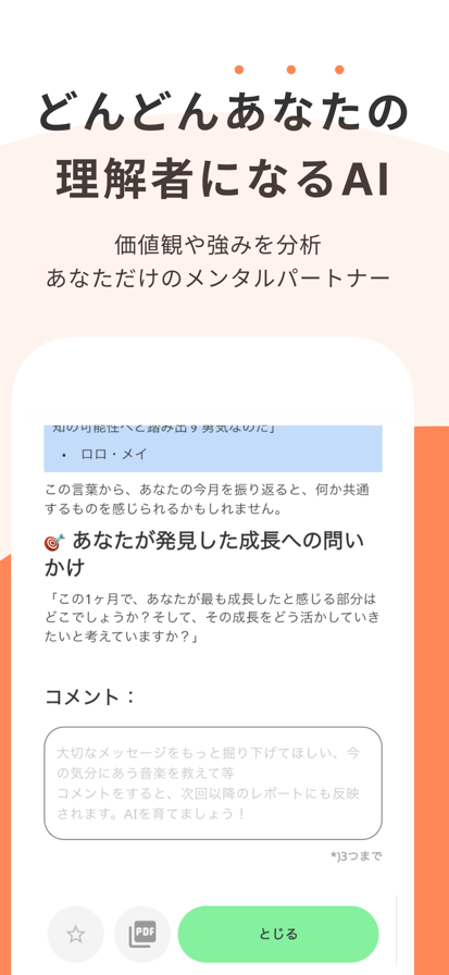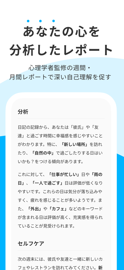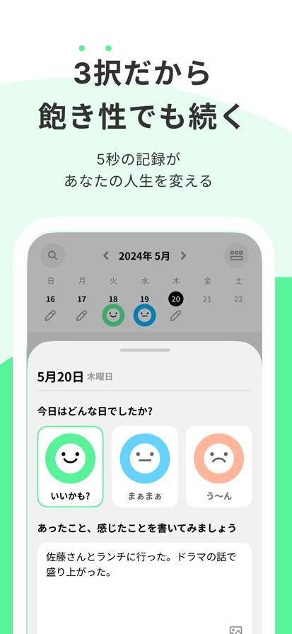增加好日子的心理习惯 每天只需3秒。只需在"好日子"、"一般"、"糟糕的日子"中选择一个——好日子就会自然增多。为什么?因为幸福不取决于发生了什么,而取决于你如何看待它。3选日记利用AI和心理学改善你的认知滤镜,帮助你在日常生活中感受到更多幸福。 3选日记的科学方法 专为难以坚持习惯的人设计,极致简约。AI根据你每天的3选记录,分析你的价值观(10种)、优势(24项)和性格(大五人格特质)。发现属于你的"创造好日子的方法",一切基于科学。通过日报、周报、月报追踪认知变化与成长。 为什么3个选择能带来真正的改变? 即使过着相似的日常,有些人却能体验到更多的"好日子"。差别在哪里?就是认知滤镜——看待事物的方式。3选日记分析你的模式,发现你独有的规律:"早晨运动让我感到充实"或"自主性高的日子幸福感更强"等。通过个性化的行动建议,帮你增加更多好日子。 主要功能 ① 3秒情绪记录 3个选择:快速简单决策的最优选项数(基于脑科学) 可选详细记录:想写的时候可以自由书写 习惯养成优化:简单到真的能坚持下去 ② 科学自我分析引擎 认知滤镜诊断:理解为什么感到幸福或不幸福 价值观分析:用施瓦茨理论量化10种核心价值观 优势发现:用VIA 24项性格优势可视化你的才能 性格洞察:用大五人格理解行为模式 ③ 加速成长的AI报告 日报:回顾今天,获得明天的可执行建议 周报:追踪认知模式变化和改进要点 月报:整合价值观、优势、性格的深度自我认知 ④ 3种支持模式 温暖陪伴:困难时期的心灵慰藉 一起思考:以新视角促进领悟 推你一把:加速成长的具体建议 与其他应用的区别 与专注于"解决问题"的认知行为疗法(CBT)应用不同,3选日记运用积极心理学来"增加好日子"。我们专注于成长,而非治疗。即使日记总是三天打鱼两天晒网的人,3选形式也能让你轻松坚持。 非常适合这样的你 最近觉得"好日子"很少的人 普通日记坚持不了3天的人 想科学了解自己价值观和优势的人 想改变重复日常的人 想培养感受幸福能力的人 想改善认知模式的人 想找到属于自己成功法则的人 容易坚持的理由 3秒:最快的情绪记录 无需纠结:3个选择是最优数量 零负罪感:忙碌的日子只选一个——搞定 无广告:不受干扰的舒适环境 每月¥35:实惠的自我提升费用 科学依据 积极心理学研究证明,幸福更多取决于认知(看待事物的方式)而非环境。3选日记帮助你改善认知,让你在同样的日常中感受到更多幸福。 安心 & 安全 基于心理学理论设计 隐私保护是首要原则 这不是医疗行为 今天就开始的理由 每天3秒的积累,将切实改变你的认知滤镜。试试7天的3选习惯吧。一周后,你一定会发现自己开始期待数一数好日子了。 免费下载,迈出拥有更多好日子的第一步。