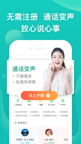 服务全球超过86个国家的倾诉平台,用户信赖的移动互助应用,众多精英倾听者:职业规划师、催眠师、律师、各种背景过来人(海归、创业者、超能妈妈、教育达人超百种行业资深人士),总有一个能帮你! 涵盖服务: 【即时倾诉】7*24小时真人在线,随时随地,想说就说,想问就问。 【主题套餐】针对个人情况量身定制方案 【温馨社区】求助广场、心情分享、公开课、群组分享、视频课堂、各种福利活动。 产品特色: 【隐私安全】1对1匿名沟通、无须注册,文字通话不留痕迹。 【实力认证】超过10万精英倾听者在线为您服务,放心说心事! 【交流方式多样】“全方位”的专业服务:文字、图片、语音、实时通话、在线视频、电台互动。让您身临其境。