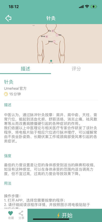 此APP的使用需要配合按摩器主机——优摩师UMEHEAL。 它是一款智能针灸按摩器,采用生物电子技术“TENS”及“EMS”,并结合针灸疗法,利用一种能激活人体细胞和肌肉能量的生命电脉冲,连续平缓的作用于相应穴位或部位,从而一键缓解各种酸痛僵麻、放松身心,还可以起到健身美体的作用。 【匠心专著,极致按摩】 1、3大功能版块 优摩师由三甲医院的医生专家、专业按摩大师及健身教练合作开发,可以快速缓解各种常见病痛,满足用户健身减肥需求以及按摩放松的目标。 2、6大基础按摩手法 优摩师独家研究设计了针灸、刮痧、按压、揉捏、推拿、捶打6大基础按摩手法,惟妙惟肖,给你最安全、真切的按摩享受。 3、600+医疗级云方案 优摩师内含600+医师级专业按摩方案,可以让您迅速缓解疼痛、轻松健身美体、即刻享受放松,并且不断更新优化,满足追求极致的你。 【人性设计,知你所想】 1、喜欢的按摩程序可一键收藏,方便下次使用; 2、独特的自定义功能,想要的按摩方案可随心定制; 3、个性化的推荐功能,通过云数据给你最想要的按摩体验。 【健康头条,必备资讯】 海量健康资讯每日推送,提供贴心的保健养生窍门,追踪焦点的医疗健康事件,解读热门的医疗健康话题,让你在购买设备之前也能轻松享受健康生活。