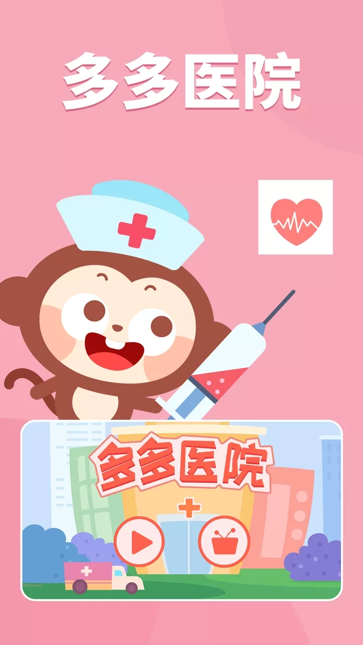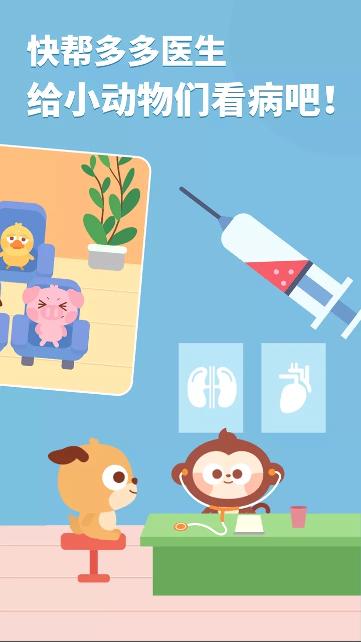 由儿歌多多团队精心打造,爸爸妈妈的好选择,小朋友都喜欢! 百万儿歌故事、动画绘本、益智启蒙、真人舞蹈、亲子游戏……更多优选内容只为给孩子一个快乐的童年。 「多多医院」模拟真实医院治病场景,根据病症对症治疗,打造轻松活泼的就医氛围,培养宝宝对疾病的预防意识以及就医知识的认知,缓解宝宝对医院的恐惧感。让小朋友从小就树立起正确的医学认识,加强锻炼身体,勇敢面对疾病!一起打败病痛! 小朋友,一起来多多医院做一个全能小医生吧! 天哪,这么多小动物都生病了哇! 为什么小鸭子的眼睛一直在转圈?小熊猫抱着胳膊很难过的样子?小老虎一直捂着嘴巴在嚎叫? 小朋友们,多多医院开始受理病患啦,快来看一看怎么治疗和预防疾病吧! 产品特色 [真实场景体验] 十种生活常见疾病:包含卡刺、划伤、摔伤、飞虫入耳、发烧、中暑、消化不良、骨折、牙疼、眼疾 [丰富治疗手段]拔刺、清理伤口、上药、滴眼药水、打针输液......模拟多种真实医疗手段 [真实医患对话]宝宝可以根据游戏中的对话克服对医院的恐惧感,提升孩子的安全保护意识,可以有目的性的反馈自己的病痛 [贴心预防提醒]治疗好病症之后贴心提醒宝宝注意预防,避免不良习惯引发病痛 好玩又益智,科学又涨知识,小朋友,快来开启多多医院治疗之旅吧! 儿歌多多,千万家庭认知启蒙的放心之选,宝妈宝爸哄娃神器!更多有趣好玩的亲子游戏儿歌故事动画片,让孩子的童年更加快乐! 更推出多多的节日、多多救援队、多多超市、多多美食街、多多小警察、多多恐龙车、多多爱郊游……等益智小游戏,让宝宝随时随地都能快快乐乐玩耍,轻轻松松学本领。