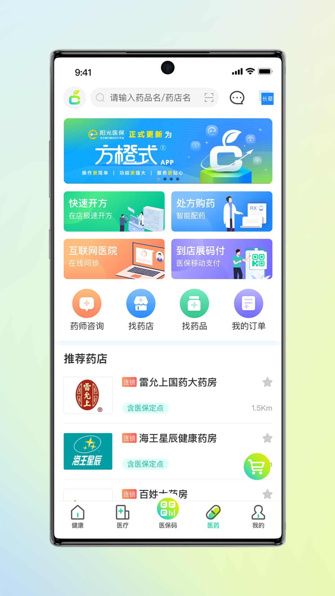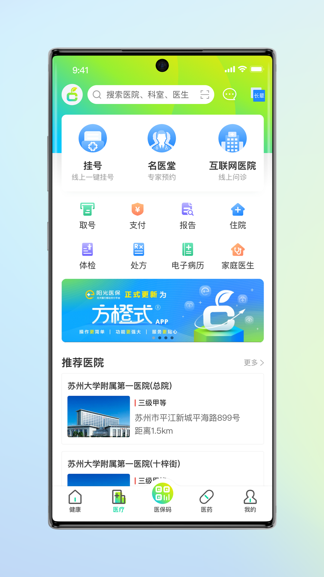 “方橙式”APP包含健康、医疗、医药三大服务内容,它以健康管理为中心,构建“防未病、治已病”的服务闭环,建立“三医融合”的互联网医疗健康新生态,为百姓求解出全生命周期中的最优值。其主要功能:<br>健康:场馆预订:提供线下场馆预订功能;赛事报名:提供体育赛事报名功能;康复训练:提供运动康复、医学康复训练免费视频。<br>医疗:挂号:提供上线医院实时、预约挂号功能;互联网医院:提供线上问诊及常见病、慢性病复诊开方功能;医保自费融合支付:提供诊疗费自费+医保一体化支付功能;报告查询:提供上线医院检验、检查报告查询功能;体检:提供上线医院体检报告查询功能;住院:提供上线医院住院预缴金缴纳功能<br>医药:电子处方一键购药:提供凭处方在上线零售药店线上预订药品、送药到家或到店自提服务;在店购药扫码支付:提供客户在药店购药时自费、医保扫码支付<br>