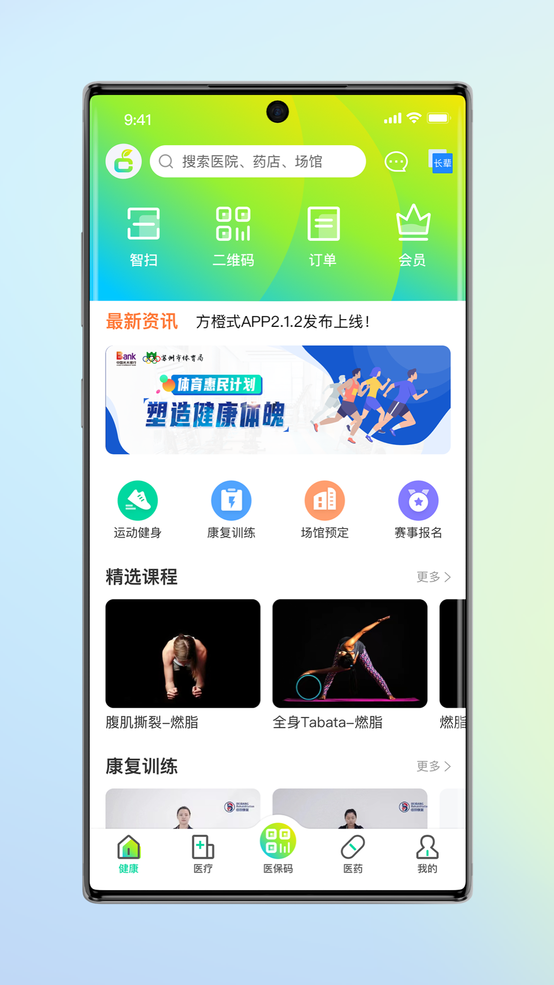 “方橙式”APP包含健康、医疗、医药三大服务内容,它以健康管理为中心,构建“防未病、治已病”的服务闭环,建立“三医融合”的互联网医疗健康新生态,为百姓求解出全生命周期中的最优值。其主要功能: 健康:场馆预订:提供线下场馆预订功能;赛事报名:提供体育赛事报名功能;康复训练:提供运动康复、医学康复训练免费视频。 医疗:挂号:提供上线医院实时、预约挂号功能;互联网医院:提供线上问诊及常见病、慢性病复诊开方功能;医保自费融合支付:提供诊疗费自费+医保一体化支付功能;报告查询:提供上线医院检验、检查报告查询功能;体检:提供上线医院体检报告查询功能;住院:提供上线医院住院预缴金缴纳功能 医药:电子处方一键购药:提供凭处方在上线零售药店线上预订药品、送药到家或到店自提服务;在店购药扫码支付:提供客户在药店购药时自费、医保扫码支付
