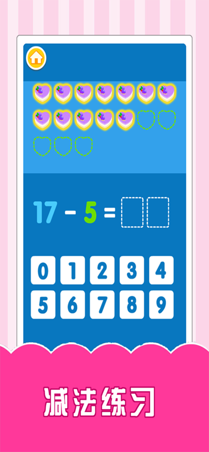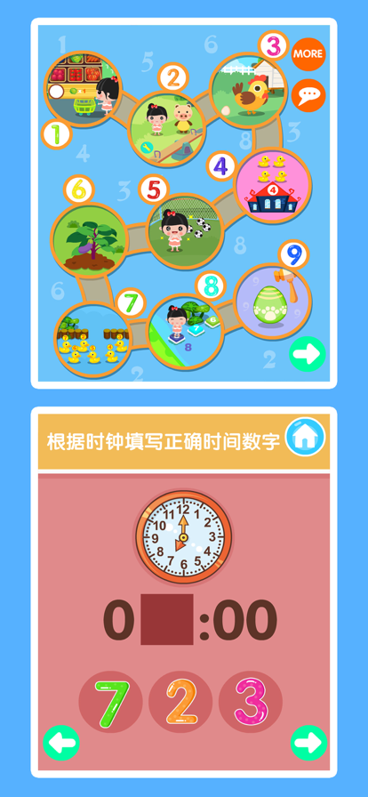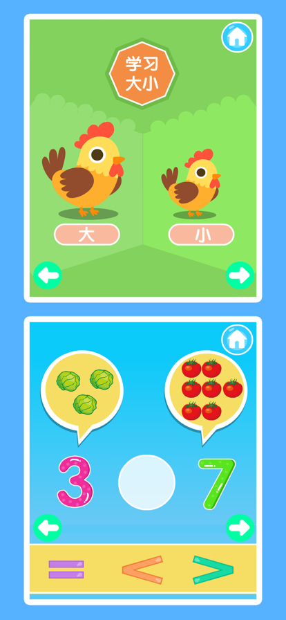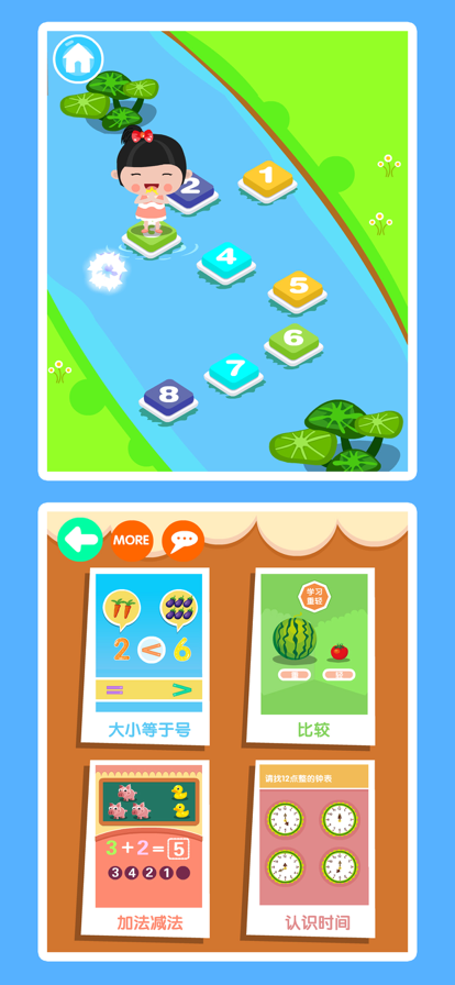 这款游戏主要开发孩子对数字的认知,丰富数学概念,让孩子通过趣味的场景游戏从而爱上数学。 首先认识、学习1到9数字,反复的学,听,看,然后根据自己所学习到的知识,进行以下的训练。 训练课程: 1、大小等于号 2、20以内加减法 3、认识时间 4、比较 每天十分钟,循序渐进,每天进步一点点!