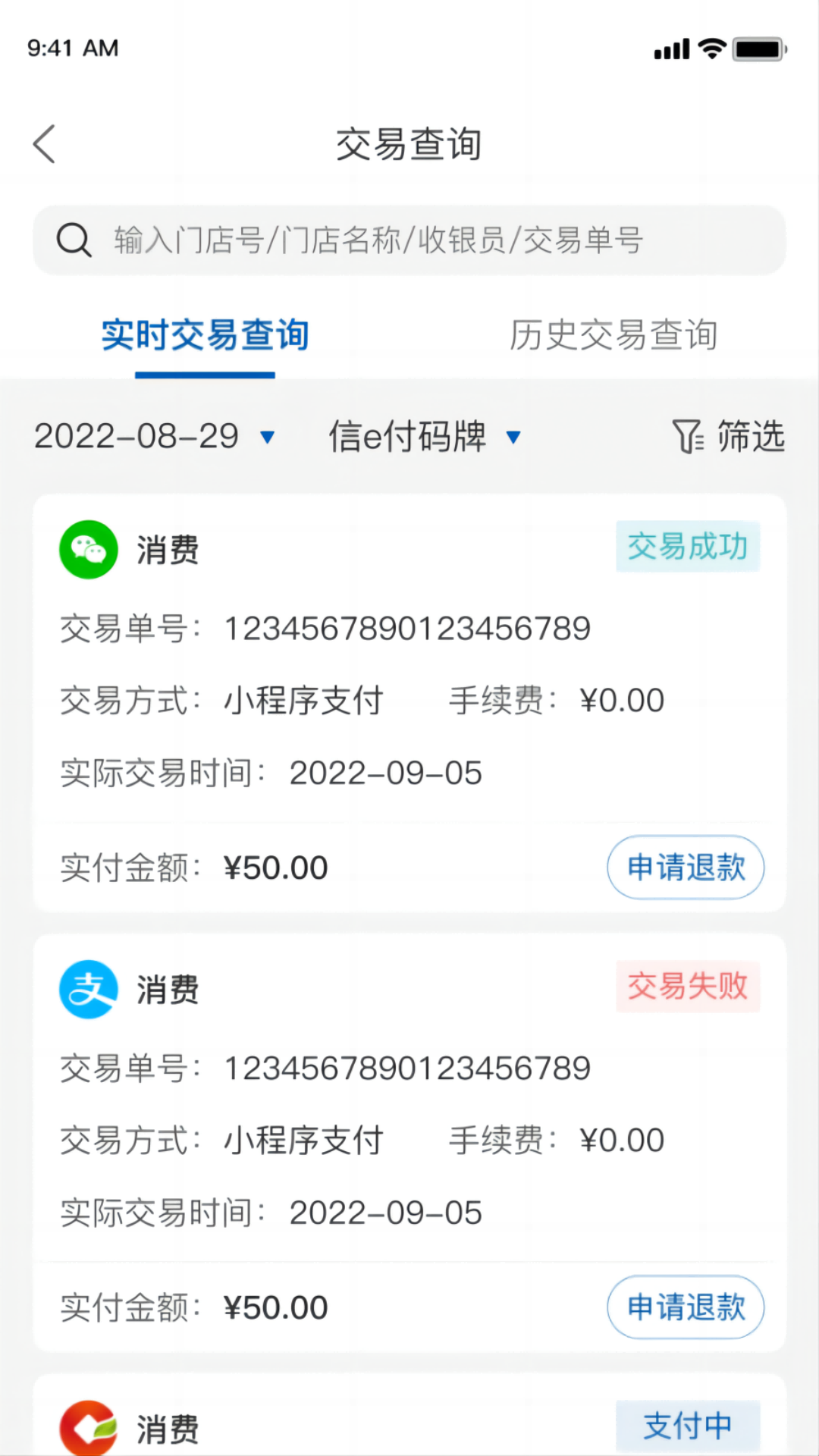 金农信e付是安徽农金针对全省收单商户全新推出的收单服务管理软件。主要功能是查询并处理用户二维码聚合支付订单,处理退款,查询交易统计等,同时还具备安徽农金旗下信e生活商城商家服务管理功能,能够帮助商家随时进行商城交易信息管理。 该应用只针对特定用户使用,无注册功能。 【首页】支持商户展示收款二维码和进行扫码收款交易、信e生活商城团购二维码核销交易,查询当日营业情况,管理门店设备,查询交易记录。 【经营分析】为商户提供近期交易统计数据汇总展示及趋势图展示功能。 【信e生活】用于管理安徽农金旗下信e生活商城相关业务功能。 【我的】支持用户查询商户信息、个人信息、商家认证状态、修改登录认证方式等功能。