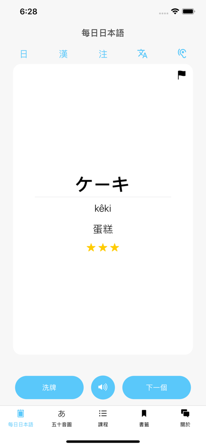 你在为学习日语而烦恼吗? 除了五十音学习卡和日文词汇以外,你想操练不同类型的练习吗?恭喜你! 「每日日本语」正符合你的需要。 「每日日本语」包含五十音表、词汇、聆听测验、选择题、翻译练习 (例如: 平假名转换片假名、片假名转换罗马拼音、罗马拼音转成汉字等等)。每日花十数分钟练习,便能逐步提升你的日语水平。这个应用程式特别为日语初学者及中阶学者而设。 「每日日本语」将读、写、听练习集结为一,一定会满足你所需。 功能: - 「每日一字」 - 「五十音图」,包括清音、浊音和半浊音 (设有选择题测试自己对平假名、片假名和罗马拼音互相转换的熟练程度) - 五十堂课,其中包括单字、词语、句子及以下功能: - 「读音示范」: 透过读音示范来学习每个词汇,加强记忆。 - 「搜寻」: 输入平假名、片假名、罗马拼音或词汇的意思搜寻课堂里的字句。 - 「学习」: 听到读音后,输入相应的平假名,以更加互动和容易的方法学习每组字句。这个训练有助加强聆听、阅读和写作能力。功能设有不同学习模式,你可以顺着每节课堂里词汇出现的次序来做测试,亦可以选择随机抽取词汇。另外,你可以选择在有提示之下做练习。 以及在首三堂课尝试下列功能: - 「聆听」: 听完朗读后,用家需选择正确答案。用家可选择将答案显示为汉字、罗马拼音或英文。 - 「测验」: 透过选择题训练自己对平假名、片假名、汉字和罗马拼音互相转换的熟练程度。 - 「朗读」: 你有幻想过请老师一次过朗读课堂里所有词汇?若果有,你就要试试我们的朗读功能。 朗读功能会将课堂里逐个词汇朗读一遍,在每个读音示范后都会用英语解释生字的意思。 升级功能: - 五十堂课,并包含所有上述功能。 适用于正在学习「大家的日本语」的学生,也适用于正在努力准备考日本语能力试验 JLPT 的学生。 我们很需要您给点意见,我们会越做越好。 info@dllm.io