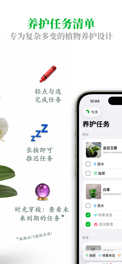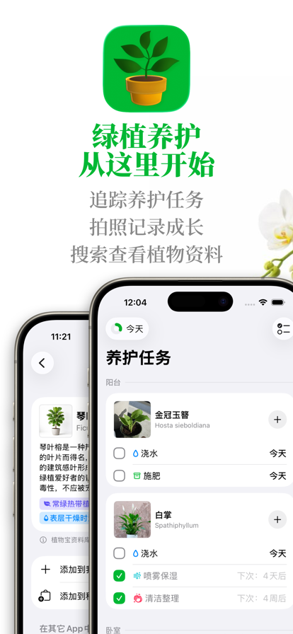 还记得上次给绿植浇水是什么时候吗?你是否需要通过照片记录植物的成长?想要养绿植,却不知从哪里开始?这些问题的答案,《植物宝》都有! ### 浇水、施肥,智能提醒 ### 植物宝帮你追踪植物养护任务,包括浇水、施肥、换盆等等。植物宝会在任务到期时提醒你。你可以将任务设置定期重复,或是设置一次性任务。你可以在任务界面轻松推迟到期的任务——非常适合该浇水时盆土还很湿润的情况。 你的养护任务将被分组整理,你也可以提前完成明天的任务,方便将繁杂的养护时间表合并。无论你只有一株绿植还是上百花卉,植物宝都能帮你照顾得井井有条。 ### 追踪植物成长 ### 使用照片和文字记录绿植花卉的成长历史。你可以清晰记下发芽、开花的日期,或是以年为单位记录植株成长。 忘了上次什么时候浇水、什么时候施肥换盆了?这些问题植物宝都能帮你解答。 ### 绿植花卉 井井有条 ### 使用房间和分组整理绿植,井井有条、方便查看。如果你在多个地方有绿植(比如公司、度假屋等)还可以添加多个位置来一同照顾。 使用分组来统一给植物浇水、施肥。例如你可以将同一个花盆中的不同植物添加到同一分组,方便照顾。 ### 新手上路 免费使用 ### 新手上路,绿植数量不超过三株?植物宝可以永久免费使用。想要解锁更多的植物数量,你可以使用应用内购解锁。 ### 有机App零添加 ### 植物宝由一名独立开发者倾情呈现。你的付费直接支持App功能开发和维护,而不是喂养一个庞大的运营团队。 植物宝App不含广告。不会弹窗让你读 “团队的最新文章”。不会让你看《新手常犯的五个错误》。无需注册、无需登录,你的数据永远属于你。 植物宝App可以离线使用——为什么一个绿植养护的App一定要联网呢?植物宝使用iCloud同步你的数据,不存在开发者跑路丢失数据的事情。It just works.