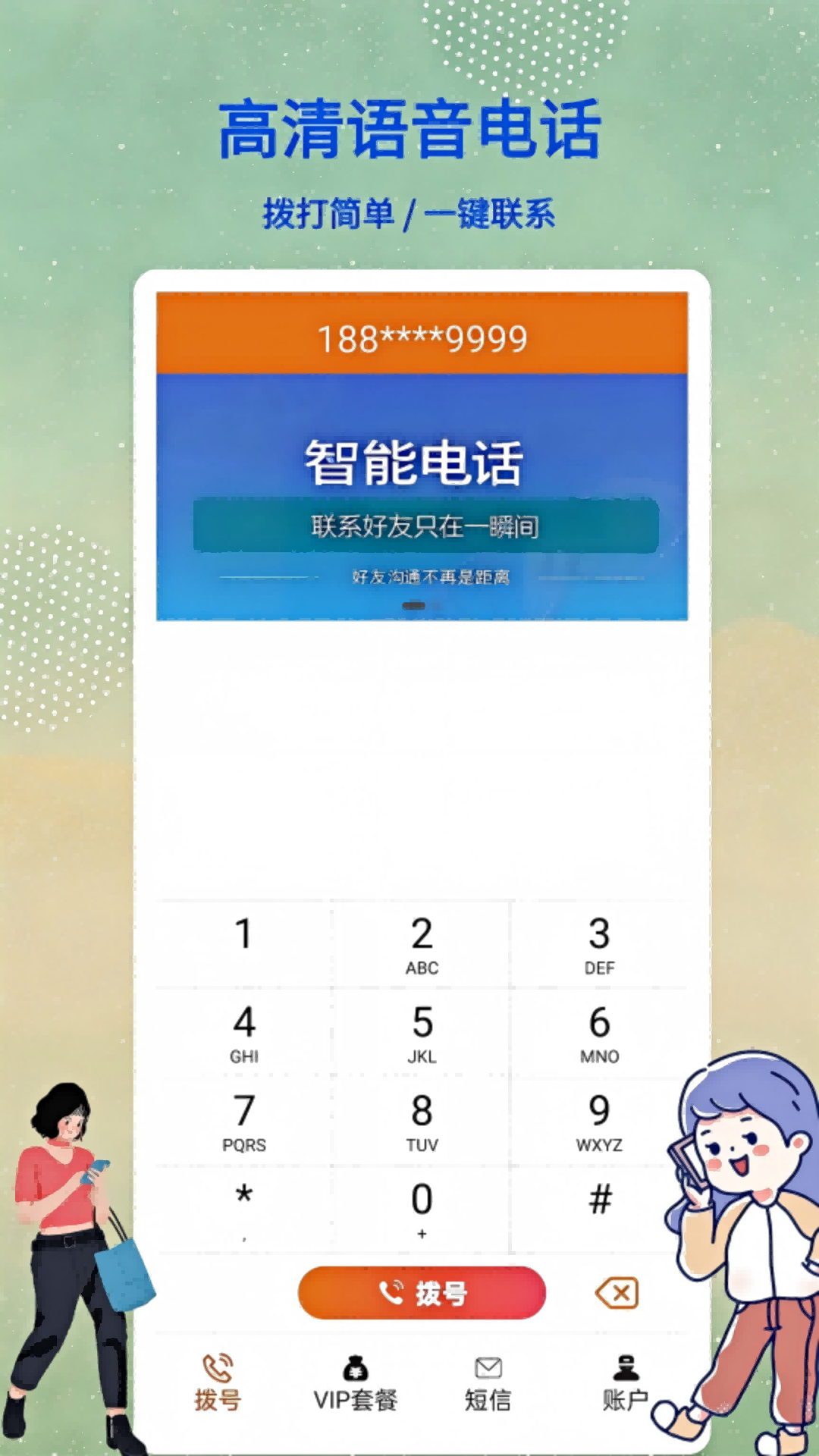 真挚的感情值得用心呵护,微微电话用高清音质便捷拨打全球电话。对方无需安装App,也无需联网。微微电话还提供网络短信的功能。帮助您在因为误会导致感情危机的时候,多一个解除误会的机会。微微电话提供了多种主题色彩,用户还可以自定义通话背景,提供了通话录音功能,以便保存重要通话资料,提供云端通讯录备份功能,可以保存多个通讯录备份,随时可以还原到本机。