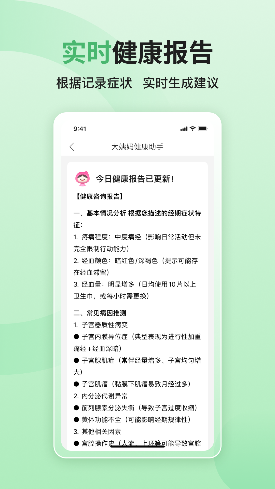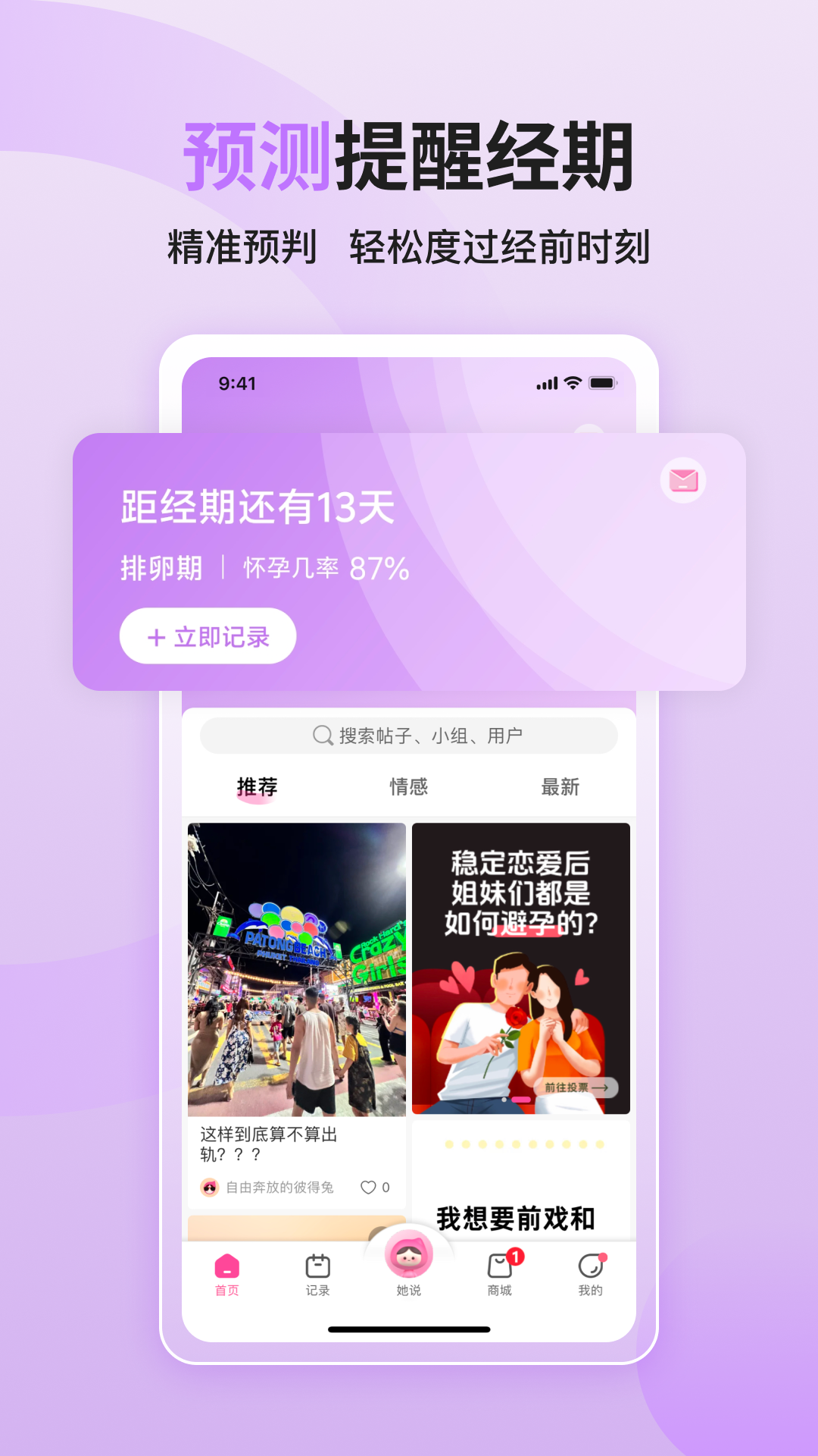-超精准的经期助手,超1.2亿女性都在用!<br><br>大姨妈是一款专注于女性健康的经期管理APP,不仅能精准预测和提醒月经周期,还提供全面记录工具与丰富的健康知识。<br><br>拥有大姨妈APP您将可以:<br>- 获取精准经期预测,轻松度过经前时刻<br>- 记录自身症状,获取专属健康报告<br>- 查看完整时间线日历视图,云端储存数据<br>-清楚了解排卵期排卵日,无忧备孕<br>- 每天推送健康小贴士,学习科普知识<br>- 走进女性私密社区,找搭子聊心事<br><br>-大姨妈健康建议免责声明<br>大姨妈提供的所有经期记录和建议不可被视作医疗建议或诊断,请勿替代专业的诊断和治疗。<br>如您遇到任何月经相关健康问题,请以专业医生的判断为准。<br><br>联系我们<br>- 电邮:kefu@dayima.com<br>- 小红书:@大姨妈月经期助手<br>- 微博:@大姨妈APP<br><br>大姨妈,和你一起在乎你。