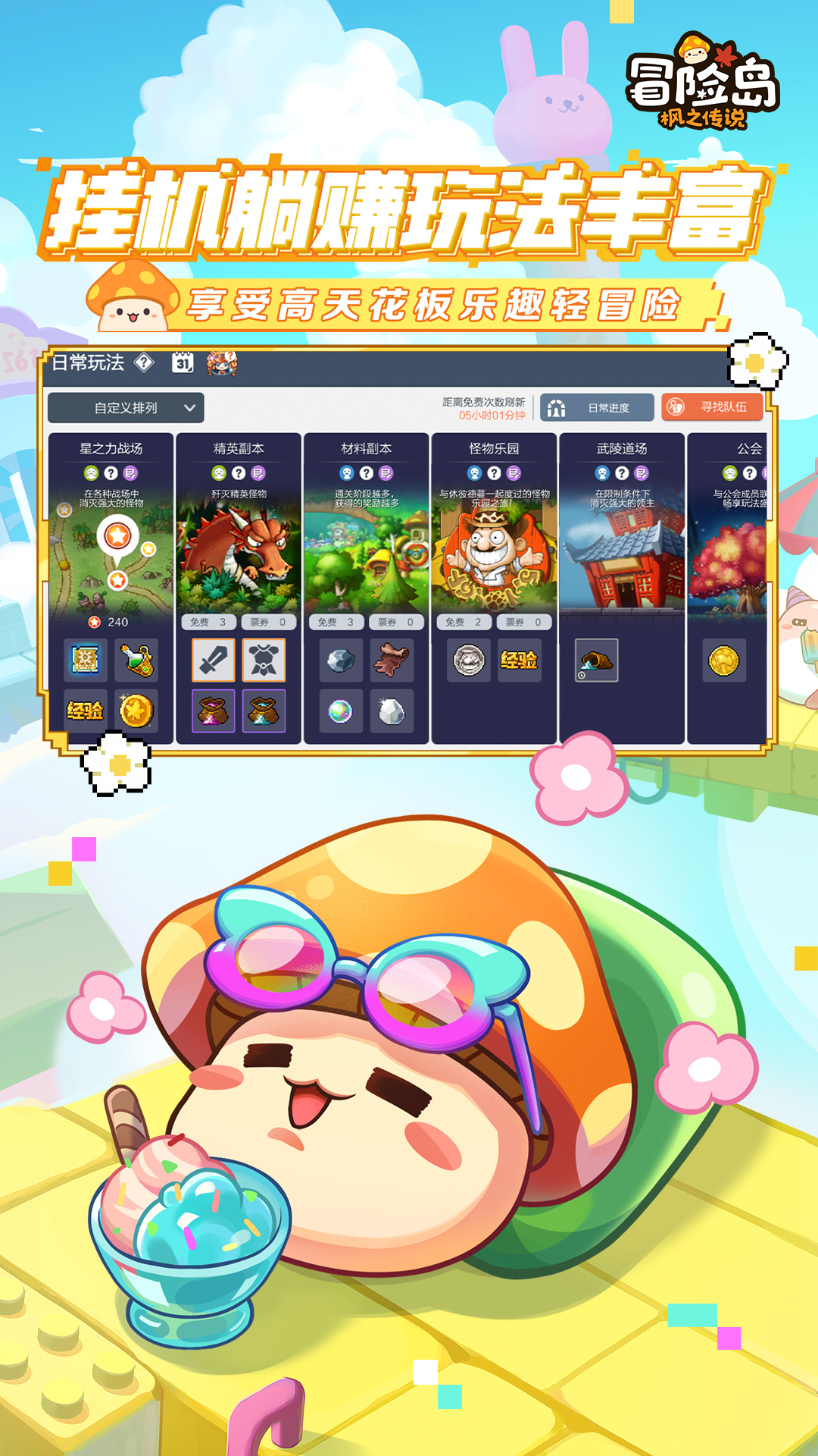 Nexon冒险岛正版授权,好玩又经典!<br>——冒险岛正版IP新游 <br>回忆满满的射手村、天空之城,熟悉的蓝蜗牛、绿水灵,经典循环的BGM,邀你再度开启焕新冒险!<br>——“轻”爽冒险再升级<br>免费挂机轻松升级,畅快击打爽感爆炸!更有超轻小包体,秒开无压力!<br>——个性时装风格万变<br>时尚造型不止“亿”套,每个部件都可自由搭配,每天都能变身冒险新造型!<br>——丰富萌宠助战进化<br>野猪王、花蘑菇、柔道熊猫......经典萌宠再度回归!一次带7只,助战新升级!<br>——花式组队爆揍BOSS <br>冒险团集结,远征队、武陵道场、金银岛争霸等经典挑战再临,扎昆、蝙蝠魔通通来挨打!