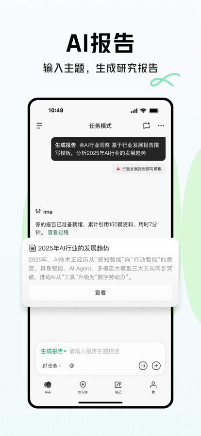 一、核心功能 1. 读——多模态内容 AI 解读 IMA 具备强大的 AI 解读能力,能够对文本、图片、音频等多模态内容进行快速问答和总 结,帮助用户准确理解信息。无论是学习资料、工作报告,还是新闻资讯,IMA 都能为您提 供精准的解读服务。 2. 写——AI 主题写作与修改 利用先进的人工智能技术,IMA 可以协助用户进行主题写作、修改和润色。无论是撰写 论文、报告,还是日常邮件,IMA 都能助您快速输出高质量内容,提升写作效率。 3. 问——全网信源智能问答 IMA 基于全网信源和个性化知识库,为您提供智能问答服务。遇到问题时,只需一键提 问,IMA 便能高效地为您找到答案,节省搜索时间,提高工作效率。 二、特色亮点 1. 三块能力相互结合,丝滑转场 IMA 将解读、问答、创作三块能力紧密结合,实现边看边问、边写边搜、边问边记的丝 滑转场体验,让您在处理信息时更加得心应手。 2. 个性化定制 IMA 支持个性化设置,根据用户的使用习惯和需求,为您打造专属的智能工作台。