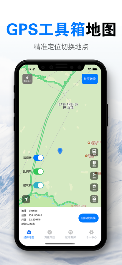 这个是一款经纬数据地图,提供多种坐标系经纬度转换,不同长度单位尺寸转换,路况显示、路线绘制、图层切换、截图分享等,提供海拔、气压、磁力、方向等数据 展示等。