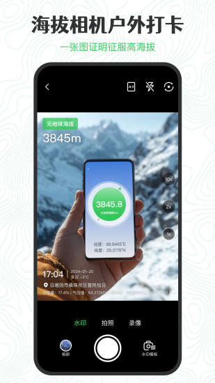 主要功能: 1.测海拔:通过手机GPS或传感器精确测量位置、海拔、速度、气压等数据,支持连续测量。(无网也能测) 2.指南针:无需网络使用手机传感器实时测量方向,气压(需手机支持),同时显示经纬度、速度、磁场等数据。(无网也能测) 3.卫星图:高清卫星图显示,高峰、低谷,一览无遗。 4.工具箱:50多项常用功能,简单又好用。 5.登山模式:在地图上实时显示登山路径、耗时,以及爬升、下降高度。 6.海拔导航:支持多种地图软件导航过程中查看海拔高度。 7.海拔相机:用户拍照实时叠加炫酷海拔水印,地址、时间等信息。 8.含氧量:实时显示当前还海拔的含氧量,为您的健康护航。 9.轨迹记录:实时记录行走,登山轨迹,保存海拔、速度、气压等数据(需手机支持),并以动态曲线图显示。 10.智能游记:根据照片地理数据自动生成节假日的游记或自行撰写,并可与用户分享。 11.本地收藏:本地保存地点、路线,以及路线中的海拔、速度等数据,并可随时查看路线轨迹以及统计图。 12.美图分享:支持拍摄并分享照片,自动读取照片经纬度,把身边美好分享给大家。 13.美图收藏:可以保存网友分享的美图,点赞以及评论。 14.天气预报:支持全国范围内的当天按小时预报及7天天气预报。 15.天气预警:发生恶劣天气、自然灾害时,自动发送通知提醒用户。 特色功能: 1.无网使用:在无网环境下也能测量海拔、定位、轨迹记录等。 2.后台记录:切换到后台仍可以不间断记录轨迹、测量海拔、速度。 3.登山模式:地图实时显示登山路径、耗时以及爬升、下降高度。 4.车载模式:界面简洁,显示海拔、速度,还可以手势操控音乐播放。 5.海拔导航:支持多种地图软件导航过程中查看海拔高度。 6.海拔相机:在用户拍摄的照片上实时叠加炫酷的海拔水印。 7.智能游记:根据用户照片地理数据自动生成节假日的游记,并可与用户分享。