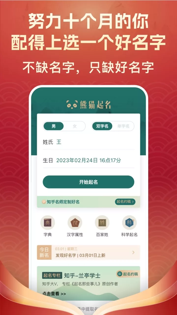 正版熊猫起名,某书推荐宝宝起名软件,取名,起名 起名,宝宝起名,取名-快速助力宝爸宝妈找到好名字,免费起名取名,测名改名。 熊猫起名、免费起名,取名-拥有一站式免费起名工具。 起名免费工具如:宝宝起名,文学起名,诗经起名,测名,解名,汉语字典,诗词大全,定制筛选,新周易起名,新易经起名,新五行起名,富贵起名,高分起名,小名,英文名等等,非常全面的宝宝起名大全,取名宝典。 起名-新文学起名助力宝爸宝妈打开起名灵感取名思路。 起名-打造新一代科学起名新思路。独家五大维度取名算法支撑,区别于市面上千篇一律的起名软件。真正拥有100万+名字库的起名大全。 高分好名来源于:诗经、楚辞、唐诗、宋词等。 真熊猫起名采用诗词和大数据起名,提供宝宝起名取名、改名、解名、测名一站式专业服务,强大的定制条件筛选功能包括寓意吉名,高分好名,限定字,音律笔画等,更有名字重名概率流行趋势详解等。 区分于传统易经取名,周易起名,起名大师,五行起名,周易取名,八字起名。我们更提倡科学起名,诗经起名,寓意起名。 #独家算法,名字不再平庸# 自研名字寓意情绪AI模型,识别国学作品寓意,唐诗宋词国学经典,专注名字寓意