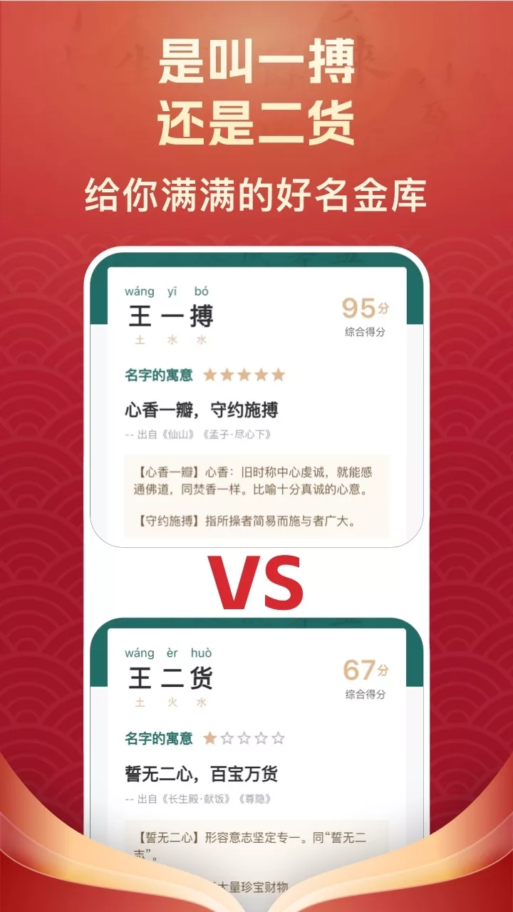 2025美名福名出炉,好听好记,气质独特!300万优选名字库!新用户享免费好名! 【精选高分佳名】筛选90-100分好名,彰显宝宝气质与个性 【九大维度解名】基础分析,名字含义,姓名学解释,名字出处,五行分析,数理笔画,字形分析,读音分析,流行程度,还有名字印象,细节评分,综合分数,让你全方位了解名字寓意 国学文化起名,满足父母期待: 【诗词来源起名】选择名字出处:来自唐诗宋词,名句名篇,诗经楚辞,四书五经,描写自然景物的诗词 【名字出自哪个诗人】可以设置多个诗人名字,从他们的文学著作中遍查好名 强大个性筛选,满足多种取名需求: 【指定字筛选】可以指定某字起名,过滤忌讳字,含有某字起名;还可以设置字的属性,偏旁,音调,笔画,书写,结构 更多惊喜功能: 【起名字典】提供多种起名工具,可以成语起名,自然事物起名,英文起名,双胞胎取名,4字取名,二胎取名,取小名等,也可以查看名字的典籍出处,同名人数,全国重名排行,汉字含义,文言文查询,五行和笔画查询,字母查询,韵母查询 【诗词起名】通过某个诗人,诗名,诗词类型,一键生成名字 【人工起名】一对一起名 【测名解析】测试打分