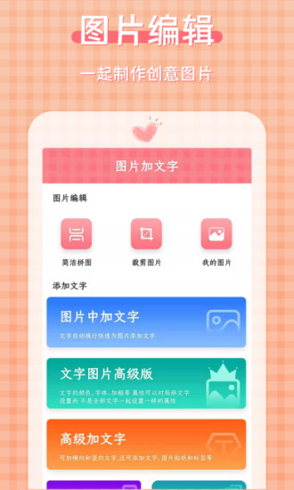 图片加文字大师是一款功能强大的图片编辑神器。它能实现文字与图片的完美融合,为您的图片注入更多独特魅力。 无论您是想记录生活中的温馨点滴,还是分享精彩的旅行攻略,它都能满足您的需求。软件拥有简洁拼图、图片裁剪等实用功能,还支持在图片中添加文字、制作文字图片以及上下加文字。 【文字编辑】功能让您在图片上添加自定义文字,众多个性字体供您选择,字体、字号、颜色可自由编辑,助您完美记录心情、分享攻略。 【背景编辑】能自由调整背景颜色和纹理,更好地衬托照片,丰富照片层次。 【海量图库】提供丰富多样的精美背景,涵盖锁屏、封面、海报等多种风格,少女风、古风等应有尽有,还有优质纹理图供您搭配,提升图片格调。 有了图片加文字大师,您无需在网上苦苦搜索素材。打开软件,即可一键添加海量背景图片、可爱贴纸、清新滤镜,轻松制作出美轮美奂的图片。而且能方便地分享至朋友圈及各大社交平台,展现您的个性品味,让您成为令人瞩目的社交达人!