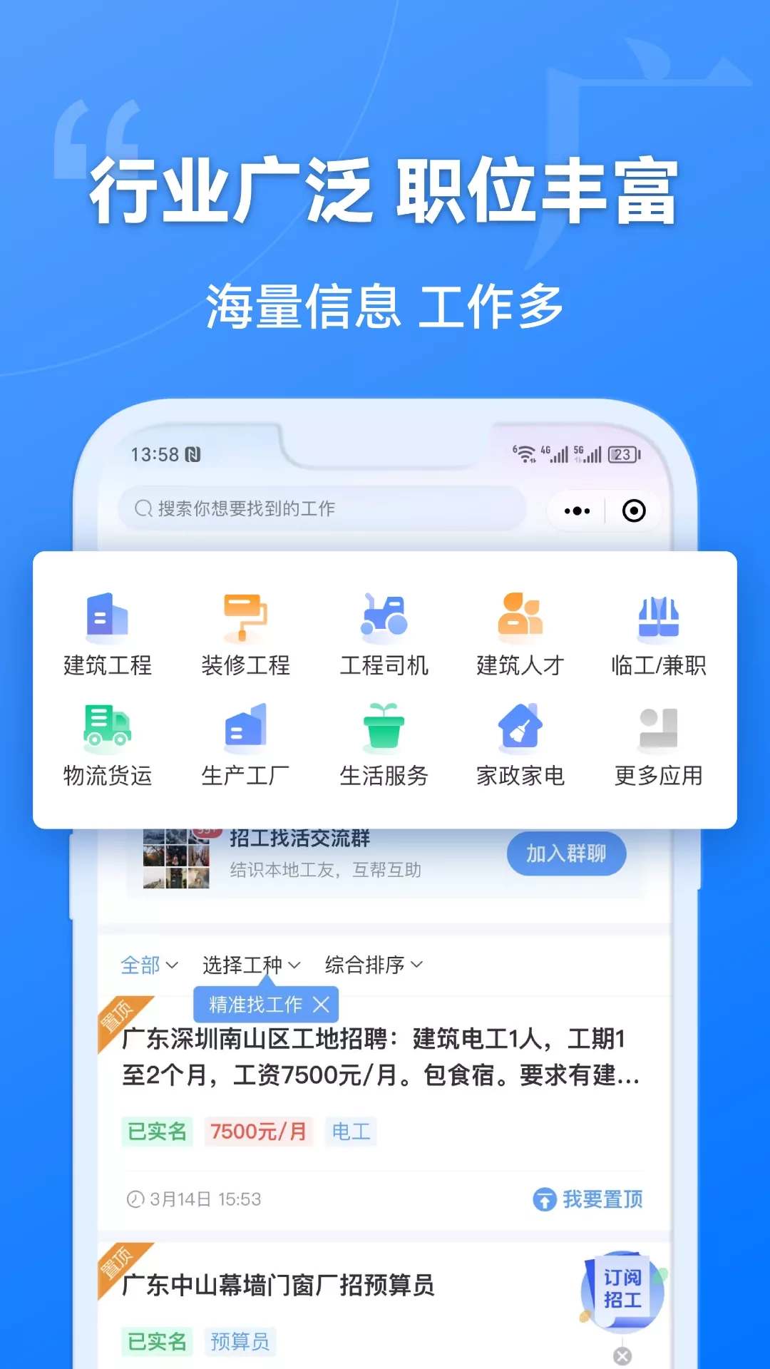 【真靠谱好活,招优质工人】 建筑港 APP 是一款打破行业界限,为所有求职者和企业提供服务的综合性招聘APP,汇聚了海量的职位信息。涵盖建筑装修、工厂制造、物流运输、生活服务、餐饮酒旅、销售客服、农林牧等多个领域的招聘求职服务 —产品特色— 【行业齐全】覆盖了1000+求职岗位,同时包含了建筑装修、工厂制造、物流运输、生活服务、餐饮酒旅、销售客服等; 【海量人才】5000万实名认证用户,通过对专业及证件等认证,让招聘者更加全面的了解求职者 —热门岗位— 【建筑装修】木工、焊工、水电工、泥瓦工、油漆工、架子工、贴砖、家具安装、家具维修、小工杂工。 【工厂制造】电焊工、操作工、组装工、装配工、包装工、质检、机械维修、电气维修、仓库管理员、普工。 【物流运输】仓储管理、货运司机、客运司机、配送员、装卸工、快递员、物流员。 【工程机械】塔吊 / 吊车、挖机 / 钩机、渣车、叉车、推土机、打桩机 / 架桥机、铲车 / 装载机。 【生活服务】安保服务、家政保洁、物业管理、家电维修/清洗/安装、汽车服务等 【餐饮服务】店长、大堂经理、厨师、领班、迎宾接待、服务员、配菜打荷、传菜员、送餐员。 —产品优势— 【智能推荐】依托先进的 AI 算法,根据企业招聘需求与求职者的技能、经验、求职意向等多维度数据,推送高度契合的求职和;求职者也能快速收到符合自身发展的岗位推荐 【便捷高效】高速浏览,一键拨号,信息轻松获取,智能推荐信息等功能,可从便捷性和智能性角度进行营销,突出让用户生活更简单的特 【及时投递】一键报名及时投递,无需沟通,让招聘者优先浏览报名人选~ 【安心保障】高度重视用户拨打情况,对沟通过程中产生的问题,提供反馈渠道,为求职者保驾护航 【联系我们】 官方网站:www.jianzhugang.com 客服电话:400-860-6025 微信公众号/小程序:建筑港