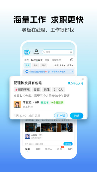 吉工家,专业的找工作、求职、招聘软件。求职者与招聘者精准匹配,高速查看。手机找工作上吉工家,求职方便,靠谱工作随薪挑! —— 产品特色 —— 【职位更精准】 为了更好地匹配求职者的职业期待,我们建立了岗位智能推荐策略。智能算法、优先推荐给你离家近的同城招聘信息,职位经过严格审核。 【职位更全面】 多职位随心挑,您身边的快捷招聘求职网。提供餐饮、零售、物流、运输、工厂、制造、销售、市场、运营、客服、人事、财务、行政、房产、建筑、AI互联网、电子、通讯、教培、金融、新能源、酒旅、广告、生活服务、兼职、日结等等行业的海量信息。 【求职更方便】 包吃、包住、包底薪、五险一金、全勤奖、双休、交通补贴、话费补贴......这些福利还没入职你就知道! 【求职更高效】 与老板在线沟通,随时随地,直接开聊,聊爽就约,拍板快,入职快,当天即可上岗。 【求职更安全】 信息审核团队为您的求职安全保驾护航,信息审核严,虚假零容忍。招聘企业严格审核,让求职更安全。 【招人快准省】 岗位免费发布试用,招人真的快,轻松找到优质牛人!快速直接沟通牛人!智能算法匹配求职者和岗位,招的放心,找的快捷! ——
