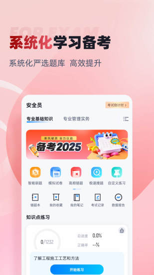 建筑八大员考试聚题库——专业备考 精准训练 助力建筑岗位认证 备战建筑八大员资格认证考试?建筑八大员考试聚题库是您专业可靠的备考助手。我们提供权威精准的练习资源,助您系统掌握建筑施工管理专业知识与技能,从容应对考试挑战。 真题模拟实战演练 应用内精选汇集历年考试真题及高质量模拟试卷,严格依据最新考试大纲与行业规范精心编写。通过模拟考试功能,您可体验真实考场环境,进行全真限时测试。考试结束后,系统即时生成详细分析报告,清晰展示您在施工员、质量员、安全员、材料员等各岗位专业知识的掌握情况。智能评估系统精准定位知识薄弱环节,帮助您明确复习重点和改进方向。 系统化知识点练习 我们依据考试要求将知识点科学分类,涵盖建筑施工技术、工程质量管理、安全生产管理、材料设备管理、造价管理、资料管理、标准规范等核心内容。每个知识点模块都配有专项练习题和详细解析,帮助您深入理解建筑施工管理专业知识。 建筑八大员考试聚题库集权威真题模拟与系统知识点练习于一体,设计科学,操作便捷。通过反复的实战演练和针对性训练,帮助您夯实专业基础,提升岗位实务能力。