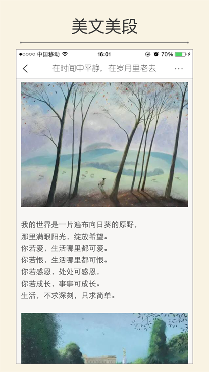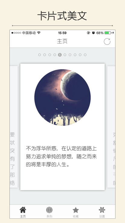 ◉ 每日精选优质心情语录和短篇美文,这里有励志的、爱情的,友情的,伤感的、开心的句子,愿你每天能遇到代表自己心情的签名,更愿你天天好心情! ◉ 我们是一个极简的每日阅读应用,没有复杂的功能,我们喜欢纯净和简单,相信优美文字和图片的力量,带给我们每日温暖! 是否为了学业、事业、金钱、名誉而压力山大? 是否被这个社会的快节奏压的喘不过气来? 是否在爱情的各种问题上纠结不休? 是否在职场的勾心斗角中疲于奔命? 赶快下载我吧,每天坚持花10分钟读一读,让心灵跟上你的步伐! ◉ 优质阅读,简单生活,从一句心情签名开始!O(∩_∩)O