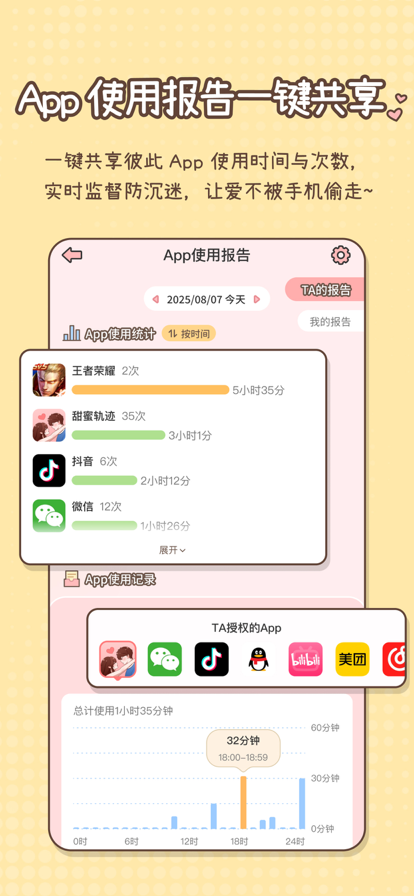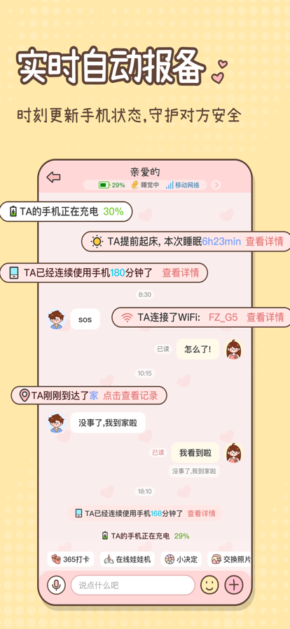 甜蜜轨迹是一款记录情侣恋爱日常的app,记录情侣相处的美好点滴瞬间,同时可以实时查看情侣位置和历史轨迹,时刻守护伴侣的安全。 【心动日常,365心动计划】坚持每天完成打卡任务,见证甜蜜爱恋,打卡提现1314元! 【时刻守护】实时查找伴侣位置,也可查看30天内足迹、停留时长和出行方式,保护伴侣安全,减少关心带来的负担。 【云养娃】领养专属虚拟宠物,可以进行有趣互动,并且涵盖了宠物从“上学”到“打工”等阶段,给主人满满的情绪价值。 【自动报备】想要了解TA的日常行程,却又不想频繁询问打扰?使用自动报备功能,上车下车,离开到达任意地点自动报备,让关心更细腻,让关爱无负担。 【每日报告】统计TA每日的手机使用报告,全天手机使用&睡眠时间报告,关注TA的日常生活节奏,提醒对方充电、及时休息,还能看到对方的通话和位置记录,生成每日报告。 【拾光记】铭记每一个甜蜜时刻,根据日期记录热恋时光日常。用图片和文字记录点滴暖心日常,在拾光记可随时回忆温馨时刻。 【拾光集】让你不错过每一个精彩瞬间,特色水印生成属于情侣的专属记忆点。 【碎碎念】情侣沟通聊天,实时更新状态,互不打扰,还支持动态表情、剪刀石头布等小趣味功能,让聊天内容更丰富多彩。 【纪念日】记录美好日期,让生活充满仪式感。帮你计算恋爱天数,提醒交往纪念日。 【锁屏小组件】可以选择在桌面小组件/通知栏/灵动岛实时更新TA的手机轨迹、使用时长、电量等状态,安全守护。 【灵动岛】灵动岛实时展示情侣状态,让关心更及时。 还有更多新奇有趣的情侣互动小游戏: 【夹娃娃机】线上抓娃娃情侣互动小游戏,为平淡的日常增添小惊喜。 【你画我猜】考验画工的时候到了!画风再抽象,也阻挡不了你们的甜蜜默契。 【桌面贴贴】更适合异地恋宝宝体质的合拍互动,选择好合拍姿势,轻松远程合拍。 【小决定】用大转盘,做小决定。还可以自定义模版玩法,设定甜蜜惩罚或奖励。 【默契挑战】情侣默契挑战,通过情侣题库问答,增强彼此之间的默契和情感联系,还支持自己设置问题,加深你们之间的默契与情感联系。 【交换照片】随机选取一张相册照片交换,轻松增加聊天趣味,再也不怕冷场。 【互动标识】坚持互动聊天碎碎念,解锁互动标识成就。 【免责声明】 根据相关法律和隐私协议规定,定位功能需要双方均安装APP并绑定授权同意才可使用,且仅用于守护家人/亲友/熟人/朋友。 【自动续费会员说明】 1.订阅周期:vip周卡7天(连续包周),月卡1个月(连续包月),年卡12个月(连续包年),永久会员(永久有效); 2.订阅价格:VIP单人月卡订阅29元/年,前三天免费,VIP单人年卡订阅39元/年,VIP单人永久会员38元; 3.付款:通过用户的iTunes账户扣款,用户确认购买后即付款。 4.续订:苹果iTunes账户会在到期前24小时内扣费,扣费成功后订阅周期顺延1个订阅周期。 5.取消续订:如需取消续订,请在当前扣费期前至少24小时操作,操作方法:从Home页进入[设置]->点击[iTunes Store与AppStore]一>点击[Apple ID],选择[查看AppleID]一>[账户设置]一>点击[订阅],选择甜蜜轨迹会员取消订阅即可。 隐私政策:https://lovelocation.kelezan.com/privacypolicy_ios 用户协议:https://lovelocation.kelezan.com/useragreement_ios 自动续费会员服务协议:https://lovelocation.kelezan.com/monthly.html