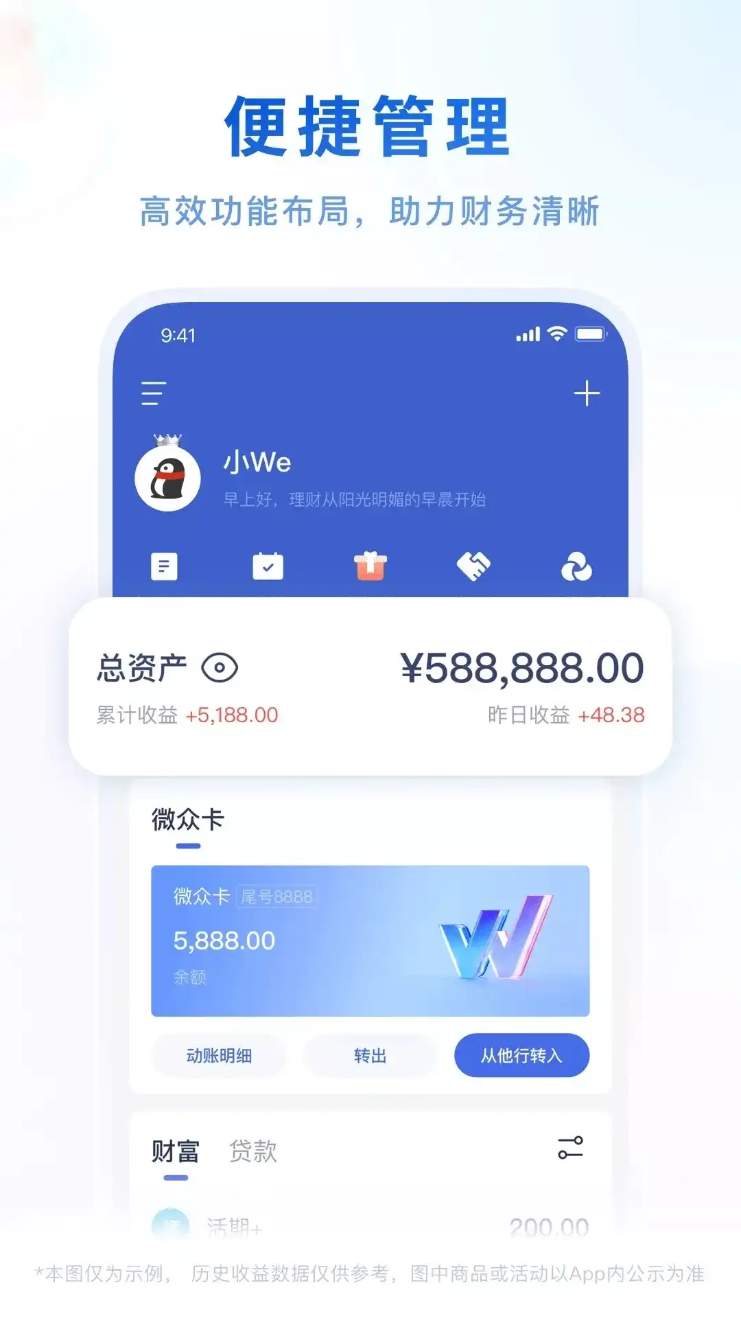 持有银行牌照,中国银行业百强,国际评级机构穆迪和标普分别给予“A3”和“BBB+”评级,被国际知名独立研究公司Forrester定义为“世界领先的数字银行”。 为客户提供一站式存款、投资理财、纯信用贷款、便捷资金调度等新型金融服务的平台,助您一步跨入安全理财舒适圈。 【安全有保障】 银行牌照,安全可靠 【在线速开户】 足不出门,即可轻松开户,随时随地享受金融理财服务 【精选理财子】 银行理财全新升级,精选全网优质银行理财子产品,理财省心之选 【灵活用资金】 活期+随用随取,您的现金管理、理财投资好帮手 【定期存储蓄】 多种期限存款随心选,存取便捷,安全可靠 【投资好专家】 股票型基金、债券型基金等精选投资产品,明星基金经理管理,省心定投 【信用微粒贷】 便捷申请,省心还款管理 【管家式管理】 设置自动计划,每月工资自动理财、还房贷、做公益,轻松管理您的资金 【服务随时享】 贴心服务随时享,客服7*24小时不间断服务,服务热线:95384 (市场有风险,投资需谨慎)