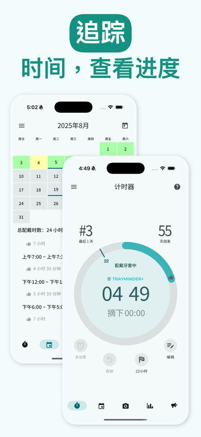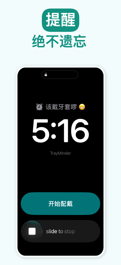 由正畸医生开发的 TrayMinder®,帮助你科学管理透明牙套的佩戴进度,无论是隐适美、时代天使还是其他品牌,让你更快获得最佳矫正效果。 你已经为你的笑容做出了巨大的投资。成功来自于细节:追踪佩戴时间、智能提醒、每天坚持。 ⎯⎯⎯⎯⎯ 计时器 • 启动/暂停计时器,记录每日牙套佩戴时间 • 自动调整时区和夏令时,无需手动计算 • 可通过电子邮件或短信将佩戴数据分享给医生 • 设置用餐后戴回牙套的提醒 日历 • 到了更换牙套的时间会收到通知 • 添加正畸预约提醒 • 添加每日笔记(如疼痛、橡皮筋等) • 使用颜色标注的日历直观查看治疗进度 TEETHIE®(牙齿自拍) • 每次更换牙套时拍照,追踪矫正变化 • 导入相册中的已有照片 • 滑动浏览笑容的转变过程 • 创建前后对比照片 • 制作延时视频,呈现完整治疗历程 ⎯⎯⎯⎯⎯ 用每月不到一杯咖啡的价格,解锁 TrayMinder+,享受更多功能: → 主屏幕小组件 → Siri 语音指令与快捷方式 → 无限照片存储 → 实时活动显示(锁屏 + 灵动岛) → 完全兼容 Apple Watch ⎯⎯⎯⎯⎯ © 2026 TrayMinder LLC。保留所有权利。 所有产品名称、商标和注册商标均为其各自所有者所有。 本应用中所使用的公司、产品和服务名称仅用于识别目的。 最终用户许可协议: https://www.apple.com/legal/internet-services/itunes/dev/stdeula/ 隐私政策: https://trayminder.com/privacy