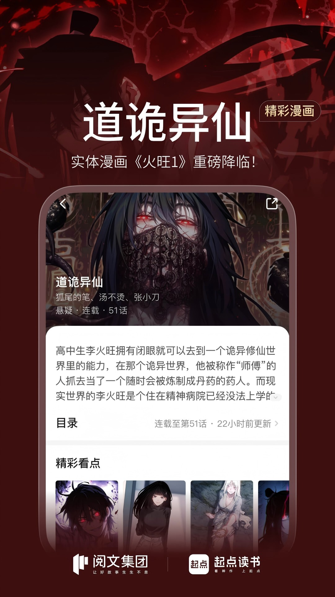 起点中文网官方移动端app,畅享正版原创网文,畅听精品有声小说,追更精彩漫画!加入书友圈,和原创作家近距离互动。<br>起点读书品牌全新升级,发布全新品牌主张“看神作 上起点”,致力于为用户持续提供优质且丰富的精品内容。<br><br>◉ 超热超全的原创小说书城,中国网络文学的起点,亿万忠实读者的选择~<br>【热门内容】正版原著、精品有声、热门漫画火爆来袭,期待与你相遇;<br>《重启人生》:当人生按下重启键,似乎一切都……<br>《哥布林重度依赖》:一只哥布林的赏金是三枚银币<br>【分类齐全】全类别热门图书随心看,玄幻、奇幻、言情、仙侠、武侠、都市、历史、游戏、科幻、二次元等,给你想要的一切!<br>【书单广场】不得不看的精选合辑,资深书迷倾情奉献,请允许我们拯救你的书荒;<br><br> 更多贴心功能和服务等你探索~<br>【免费读书】免费新书热书天天送,让你根本停不下来!<br>【活动中心】精彩活动集结,边玩边拿奖品,福利不停歇;<br>【智能推荐】私人定制,精选推荐,转角遇见你的真爱女主;<br>【云端同步】书架、阅读进度、书签、笔记自动云同步;<br>【用户书单】一步创建专属书单,从此爱上分享和发现。<br><br>………………起点读书 • 热门原著………………<br>《庆余年》:余年庆有余,不负韶华,不负卿。愿山河无恙,人间皆安。<br>《大奉打更人》:神探修仙,纵横大奉!<br>《赘婿》:愤怒的香蕉经典小说,郭麒麟、宋轶主演热播影视剧同名原著;<br>《龙族V悼亡者的归来》:江南新作,热血龙族,少年归来;<br>《长安十二时辰》:易烊千玺主演,口碑炸裂热播剧集同名小说;<br>《上海堡垒》:鹿晗、舒淇领衔主演科幻战争电影,江南同名小说;<br>《黄金瞳》:张艺兴、王紫璇领衔主演都市探险剧同名小说;<br>《流浪地球》:刘慈溪科幻小说,大热电影原著;<br>《全职高手》:蝴蝶蓝经典大作,超燃热播动漫;<br>《你和我的倾城时光》:赵丽颖主演热播都市商战剧,改编自丁墨同名小说;<br>更有《三体》、《斗破苍穹》、《星辰变》、《莽荒纪》、《琅琊榜》、《黄金瞳》、《斗罗大陆》、《萌妻食神》《异常生物见闻录》等火热原著,以及大热手游《大主宰》、《完美世界》、《斗破苍穹》原著小说。