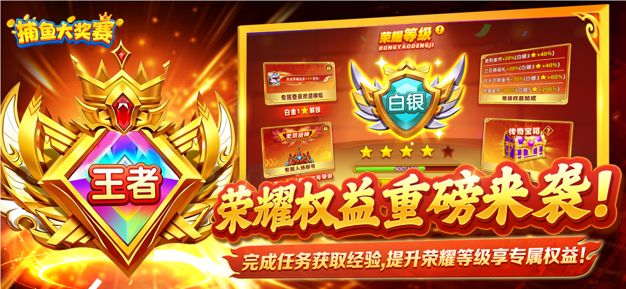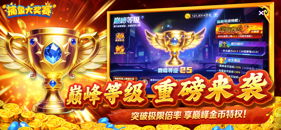 尊敬的捕鱼玩家们,《捕鱼大奖赛》是一款打鱼轻松,升炮简单的休闲街机捕鱼。 在这里您将体验到超高的BOSS倍率,超炫的美术表现。 赶快加入,享受高炮倍打鱼,满屏爆金的爆爽体验吧! 【超多福利,大量金币免费领】 登录就送海量金币,每日任务、节日玩法,多重福利领到手软。 【免费VIP,不肝不氪称霸服务器】 免费玩家赠送VIP等级,享受VIP同等福利。 【超高炮倍,金币炸翻天】 一亿炮倍,一炮赚千亿,金币不停赚赚赚。 【BOSS鱼种类多样,捕鱼不疲倦】 中外神话、动漫机甲、古代历史等题材应有尽有,使您在酣畅淋漓捕鱼的同时,享受古今中外文化熏陶。 【丰富的小游戏玩法,额外的金币奖励】 龙巢探险、海神宝藏、龙宫寻宝、蟠桃盛宴等小游戏随机触发,给您送上丰厚的金币奖励。 【特别声明】 《捕鱼大奖赛》提供游戏娱乐服务,在游戏内体验并获得成功,并不意味着现实世界的成功。 《捕鱼大奖赛》内的所有道具只可在本游戏内使用,且所有奖励与苹果公司无关。 《捕鱼大奖赛》不涉及任何赌博,无现金交易和实体奖品兑换功能。