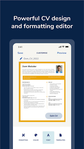 亲自准备简历往往会让人倍感压力、困惑和耗时。借助 CV Maker,准备简历将变得快速、轻松且高效。<br><br>包含的功能:<br>1) 适用于所有工作类型的专业模板<br> 我们的简历创建工具提供了一些可自定义的模板。您将根据自己的行业、资历水平和所申请的公司类型获得模板选择建议。专业设计的简历模板和示例(+ 指南)。只需 5 分钟即可编辑和下载。<br><br>2) 简历评分<br>在编辑器中提交文档后,我们的简历生成器将对比您的竞争对手为您的简历评分,并为您提供有关如何准确改进简历的详细提示。<br><br>3) 导出为 PDF<br>只需点击“查看”按钮即可生成您的简历并导出到您所需的任何来源。<br><br>4) 实时预览<br>无需互联网连接即可预览所有更改。<br><br>5) 离线支持<br>无需互联网连接即可打开并进行更改。<br><br>6) 设备间同步<br>将简历的所有信息和照片保存到云存储中。<br><br>7) 多语言<br>目前,我们支持 12 种语言。