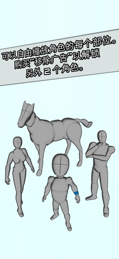 这是一个给角色摆姿势的应用,你可以尝试去摆出各种各样的姿势,也可以用应用内提供的小物件来发挥想象和创造力,去进一步装饰你的姿势。 应用有如下内容: - 可以通过设置每一个独立的关节来摆出各种各样的姿势,通过拖拽屏幕下方球体的蓝色部分来编辑关节,是非常简单直观的操作 - 可以不等比缩放各个关节 - 可以同时保存9个姿势。也可以另外保存9双手,可以分别保存左手和右手。 - 可以添加一些简单的小物件来装饰你摆出的姿势! - 可以分享摆出的姿势的截图! - 可以改变灯光的朝向(仅能照出各个关节独立的明暗信息,因此仅供参考) 移除广告后能做的事: - 撤销、重做 - 开启新角色( 女性角色 和 马 ),3个角色各自有4个相同的角色,最多可以同时让6个角色出现在屏幕上 - 编辑大部分物件的颜色和背景的颜色 - 可以把从相机和照片中获取的图片设置为背景 如果发现问题,请直接给我发送邮件。 我的电子邮箱:waci11@163.com