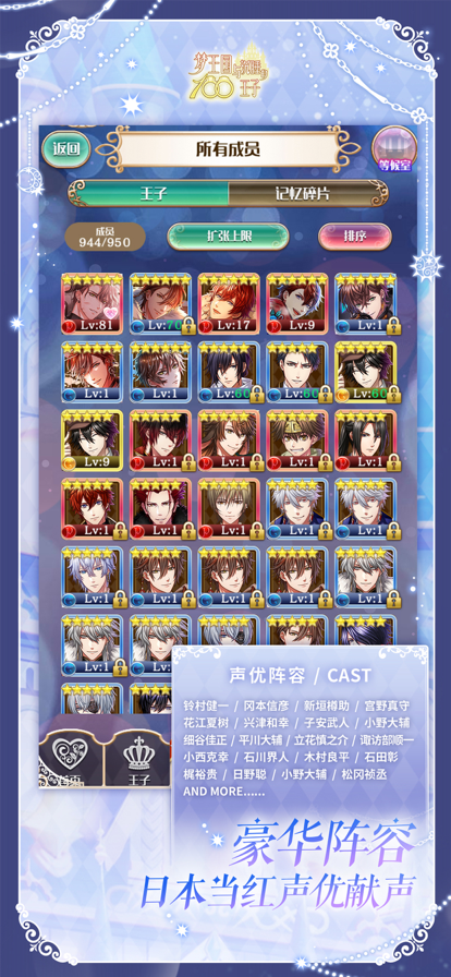 【游戏简介】 风靡日本的女性恋爱手游《梦王国与沉睡的100王子》(简称“梦100”)正式登陆中国!该游戏由知名游戏开发商GCREST打造,由bilibili游戏独家代理发行。百名顶级声优,演绎百位梦幻王子,谁将最终拥你入怀? 在下班回家途中的主人公,突然来到了另一个世界…… 这里是以「梦」作为生存力量的「梦世界」。 梦世界现在正遭受到「食梦兽」的威胁,它吞噬着人们的梦。 主人公一边抱有疑问,一边唤醒沉睡中的王子们…… 与他们一起在这个世界,夺回梦境—— 【101位日本国民级声优亮相,史上最大规模集结】 史上最豪华声优阵容惊现!前辈派、新生代大集结,每一位声优都用自己的特色声线演绎着独属于他与你之间的故事,怎能不心动? 铃村健一、樱井孝宏、宫野真守、梶裕贵、木村良平、铃木达央、鸟海浩辅、中井和哉、杉田智和、苍井翔太、赤羽根健治、井口佑一、石川界人、石田彰、市来光弘、伊藤健太郎、内田雄马、梅原裕一郎、江口拓也、逢坂良太、大河元气、兴津和幸、小野贤章、小野友树、柿原彻也、岸尾大辅、小西克幸、近藤孝行、齐藤壮马、佐藤拓也、下野紘、白井悠介、新垣樽助、泰勇气、高桥广树、立花慎之介、日野聪、寺岛拓笃、浪川大辅、西山宏太郎、野岛健儿、朴璐美、羽多野涉、花江夏树、平川大辅、藤原启治、保志总一朗、细谷佳正、堀江由衣、前野智昭、间岛淳司、增田俊树、松冈祯丞、宫田幸季、村濑步、森久保祥太郎、山下诚一郎、山下大辉、代永翼、小野大辅、钉宫理惠(等) 【日本顶级画师心血之作,上百位王子梦幻登场】 海量精美的立绘,全部出自日本顶级画师之手,美少年、大叔、正太、伪娘……阳光开朗、性格稳重、霸道、傲娇、病娇、兽耳……超过100位王子总有一款适合你!满足你对于另一半的所有幻想! 【上百条支线剧情,自由开放的恋爱故事结局】 除了主线剧情外,每一位王子与你都拥有一段独属于你们的恋爱故事。超过300张的回忆CG,200多个故事结局,是圆满还是遗憾?一切都由你的选择来决定! 【推荐iOS版本】iOS 8.4以上 【推荐设备】iPhone6s以上 【联系我们】 官方微信公众号:mengwangzi100 官方微博:梦王国与沉睡的100王子