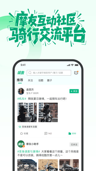 【摩友社区】:骑行动态发布、每日热门话题、兴趣摩友圈子,结识志同道合的摩友; 【爱车动态】:随时查看爱车动态,爱车位置一手掌握;一键发起爱车导航,助力轻松寻车; 【摩旅足迹】:行驶数据统计报告,自定义时间段骑行轨迹,随时回放摩旅每个精彩瞬间; 【骑行记录】:一键开始骑行,平均速度、最高速度准确记录,骑行跑山乐趣无限; 【组队骑行】:口令骑行组队,位置实时共享,一键目的地导航,共享跑山乐趣; 【安全提醒】:实时接收车辆安全预警,时刻守护爱车安全; 【折扣加油】:智能推荐附近油站,天天有优惠,低价加好油; 【福利活动】:多种摩友骑行福利活动,多重骑行好礼邀您参加; 【用车服务】:油耗计算等超多便捷用车服务;