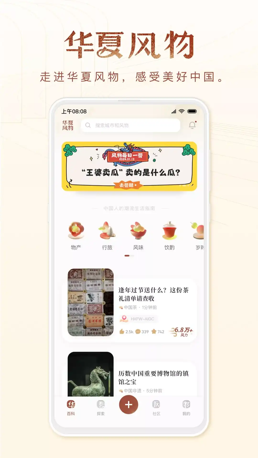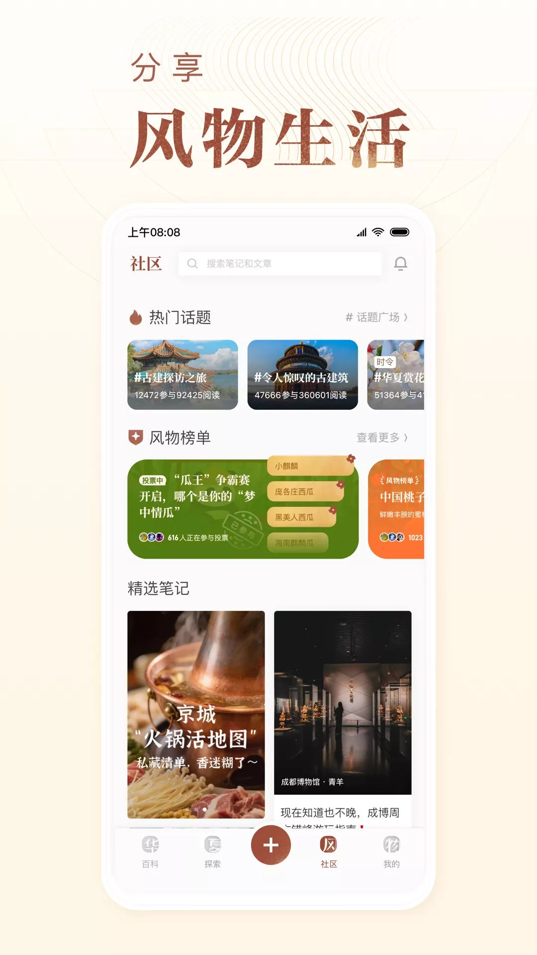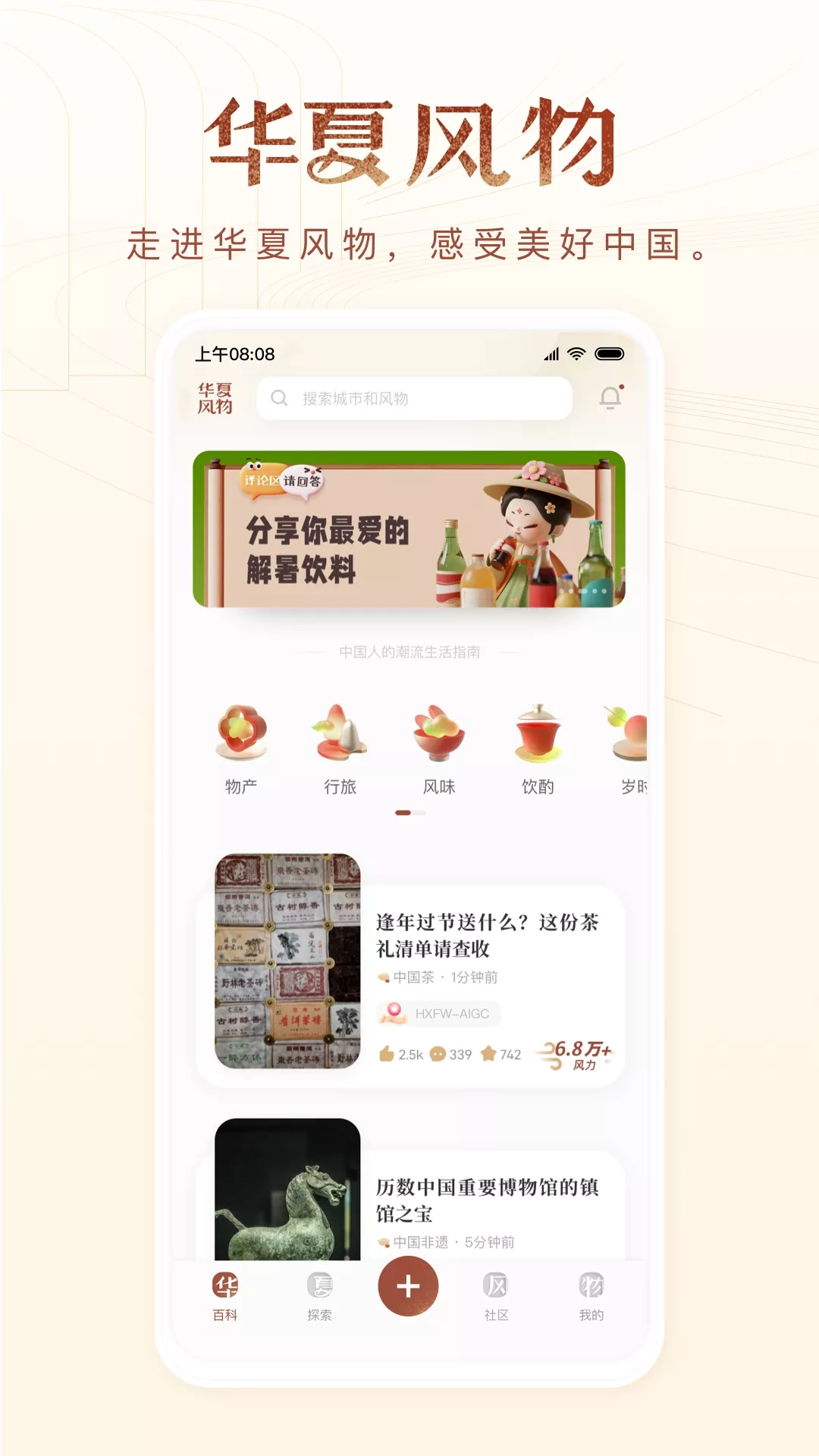 华夏风物是探索中国各地美好风物的互动平台。在这里,你可以发现每一个地方的独特物产、风景、地域文化,如蔚县的剪纸、西安的甑糕、西双版纳的雨林、上海的和平饭店等;还可以通过笔记、爆料、文章、评论等方式分享你在探索各地风物时的心得感受,让每一个人发现故乡和他乡的丰饶与奇妙,体验华夏大地的本土风物之美。 * 精选推荐:这里有全网精选风物,贴合节气,时令的美食合集,有趣的风物话题活动,在这里你可以发现华夏大地的多面美好; * 风物社区:和大家一起聊一聊那些可爱城市的小吃特产、念念不忘的美好风景、独特的非遗技艺······记录你的风物生活,分享点滴美好~ * 风物百科:这里汇集了各地特产美食、热门景点、非物质文化遗产,你可以看到专业、具体的知识解读,了解风物的真实面貌。你还可以作为风物发现官进行「风物爆料」,爆料你熟知的风物线索,完善风物百科,让更多的人认识更多新鲜有趣的风物。 * 热门城市:这里以城市为维度聚合了风物内容,你可以在这里看到你的家乡或者你向往的城市为它点赞助力,让更多的人看到它。 如在使用中遇到任何问题,可添加风物小管家微信(微信号:huaxiafengwu2020)反馈。