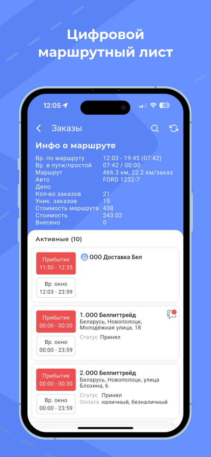 Цифровой маршрутный лист. Инструмент взаимодействия диспетчера и курьера. Используя мобильное приложение Logimus Route: КУРЬЕРЫ / МОБИЛЬНЫЕ СОТРУДНИКИ – получают удобный и прозрачный рабочий инструмент: • цифровой маршрутный лист – список заданий на день с детальной информацией по каждому заказу (адрес, контакты, особенности доставки, список и стоимость товаров и пр.) даёт полное понимание объёма работы. • привычный навигатор – возможность в несколько касаний проложить построенный логистом маршрут в любом знакомом навигаторе. • статусы заказов – приложение сокращает оформление отчётности до нескольких нажатий. • связь с клиентом прямо из приложения. • быстрая фиксация факта оплаты с гибкой разбивкой по типам платежей (наличные, карта, онлайн) прямо в процессе работы с заказом. • стоимость маршрута – возможность вести учёт дохода за выполнение маршрутов, легко сверять их с заработной платой, исключая ошибки и недопонимания. • сканирование штрихкодов – быстрая и безошибочная приёмка и выдача товаров согласно накладным. ДИСПЕТЧЕРЫ и ЛОГИСТЫ – уверены в точном исполнении плана: • быстрое и удобное взаимодействие с мобильными сотрудниками (курьерами) – любые изменения в маршруте, новые комментарии и пометки сразу видны курьеру в приложении. • автоматическое информирование о ходе выполнения маршрута и любых нештатных ситуациях (опоздания, отказы от товаров), любое отклонение от плана будет заметно в режиме реального времени. КРОМЕ ТОГО, Logimus Route – сокращает: • нагрузку на колл-центр – с помощью гибко настраиваемых шаблонов СМС-оповещений и сервиса мониторинга заказа ваши клиенты всегда будут владеть самой актуальной информацией - текущим статусом заказа, местом заказа в очереди, текущим местоположением курьера. И как следствие не будет необходимости обращаться в колл-центр за такого рода информацией. • сроки возврата тары – приложение позволяет передавать водителю информацию о том, какая тара и в каком количестве должна быть возвращена. • время адаптации новых сотрудников. Подробная информация о маршруте, заказах и чёткие инструкции дают полное понимание задач, отвечая на вопросы до их возникновения. Это позволяет новому курьеру с первого рейса работать уверенно, как опытный сотрудник, экономя ваше время и ресурсы на обучение. Logimus Route – это не просто мобильное приложение, а комплексное решение для повышения эффективности, прозрачности и качества вашей логистики.