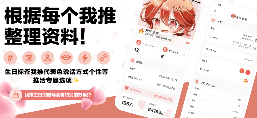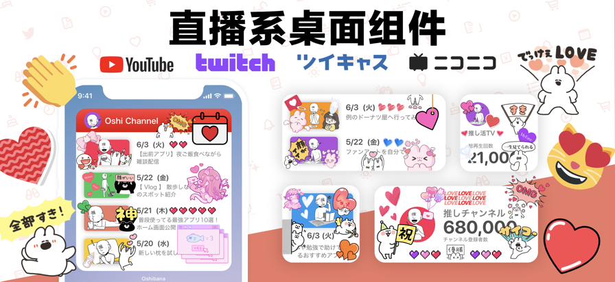 Oshibana支持所有推活中的大家,提升生活的动力 ◆很推荐这样的你使用! ・无法整理我推相关的信息 ・想用我推填满自己的生活 ・有我推 ・有很多的我推 ・不知道为什么但很忙 ・容易忘记重要的日子 ・有很多我推的图片 ・关注很多我推相关的网站和SNS ・不擅长使用日程表管理自己的日程安排 ・你的我推出生在纪元前 ・知道我推代表色(概念)【可以做的事情】 ■可以精细化管理我推的资料,性格,纪念日 ・通知以确保不会忘记特别的日子 特别的日子可以进行特别的布置■在手机桌面可以设置我推banner和 功能的组合(桌面组件功能)" ・显示「应援后○天」 ・可以声音补给(可以在手机桌面设置我推的音频随时听到声音!) ・登录多张我推的图片,可以制作动态图片的相册 ・如果我推上线了Apple Music上的音乐,可以随时在桌面上播放 ・可以在桌面上显示我推发布的YouTube最新视频,并通过点击打开 ・可以将我推的YouTube频道订阅者人数和总观看次数固定显示在桌面 ・可以将我推的推播最新直播显示在桌面 ・可以在桌面显示我推Twitch频道的最新存档 ・可以通过设置特定的关键词在桌面上显示相关的ニコニコ动画视频 ・我推占卜(根据占卜结果设置不同的我推图片) ・我推的天气预报(设置我推的图片,天气不好的时候 也能让心情变得愉快一些) ・持续显示不易忘记的日程表 ・重要日程安排的倒计时 ・只有图片的简洁的桌面组件 ・出道后○天 ・诞生后○天 ・活动开始后◯天 ・直播开始后◯天 ・首次演唱会后◯天 ・爱上后◯天 ・组团后◯天 ・相遇后◯天 ・我推的充电(可以用不充电将无法看到推送的功能) ・原创(仮)桌面组件(可以自由设置链接和文字) ・在桌面上显示Twitter推文→由于Twitter公司的 连接功能更改,目前显示画面存在问题(2023/07/14)" ・可以随机显示我推在过去推文中投稿的图片的桌面组件 →由于Twitter公司的连接功能更改,目前显示画面存在问题(2023/07/14)※图片,应援后,出道后,诞生后,活动开始后,直播后,首次演唱会后,爱上后, 组团后,的桌面组件也可以显示在锁屏界面 ※ 仅限 iOS 16及更新版本■ 推活用的键盘。" ・使用我推的图片为背景制作键盘 ・可以显示我推后◯天 ・可以用我推代表色设置键盘 ・可以对应日语与罗马字,英语 ・现在是试用版,我们正在征集用户意见! ■ 我推用的个人资料(简介/自我介绍网页) ・可以整理推活方式 ・可以简单地在网络上公开(也可以仅输入) ■ 我推链接合集 ・可以整理我推的网站和社交媒体 ・可以添加原创图片和标题。■ 推活笔录 ・可以为每个我推保存图片和文章 ・还可用于演唱会/直播等活动,我推日记,商品购买和游戏记录,以及转让历史记录管理等 ■其他方便的用途 ・支持纪元前的出生年份设置 ・根据我推的生日,纪念日和重要的日程设置通知 ・最多可以设置2种「我推代表色」※适用于CP或者同人设定 ・通过与Apple ID 连接,可以在多台设备上使用相同的数据 ◆ 欢迎提交功能想法,以及您遇到的问题" 请在应用内使用运营联系表格,或关注以下账号后联系我们。 ※可能无法回复所有消息,但一定会仔细查看。 ・官方 : https://twitter.com/Oshibana0487 ◆开发中的功能 ・关于服务的想法,改进,以及正在开发的功能, 我们已在以下URL(Trello)上公开。 ・开发中的功能 : https://trello.com/b/E9C5Ac1M提升正在推活中的你的 「每天生活的动力」 ----- ■欢迎提出功能想法和您遇到的问题。 请在应用内使用运营联系表格,或关注以下账号后联系我们。 ※可能无法回复所有消息,但一定会仔细查看。 官方 : https://twitter.com/Oshibana0487◆开发中的功能 关于服务的想法,改进,以及正在开发的功能, 我们已在以下URL(Trello)上公开。 https://trello.com/b/E9C5Ac1M ■可使用的OS iOS 14.0 及更新版本可使用。请更新并使用我们的应用。 ●使用条款 https://oshibana-app.web.app/terms_of_service.html ●隐私政策 https://oshibana.fun/privacy_policy.html 提升正在推活中的你的 「每天生活的动力」 ーーーーーーーーー 应用内使用的插图 藍川蓮协助 Twitter▽ https://twitter.com/aikwarendbiryut 突然出现的,与我年龄相差很大的义妹的故事▽ https://share.ganma.jp/magazines/fuiniarawareta ーーーーーーーーー