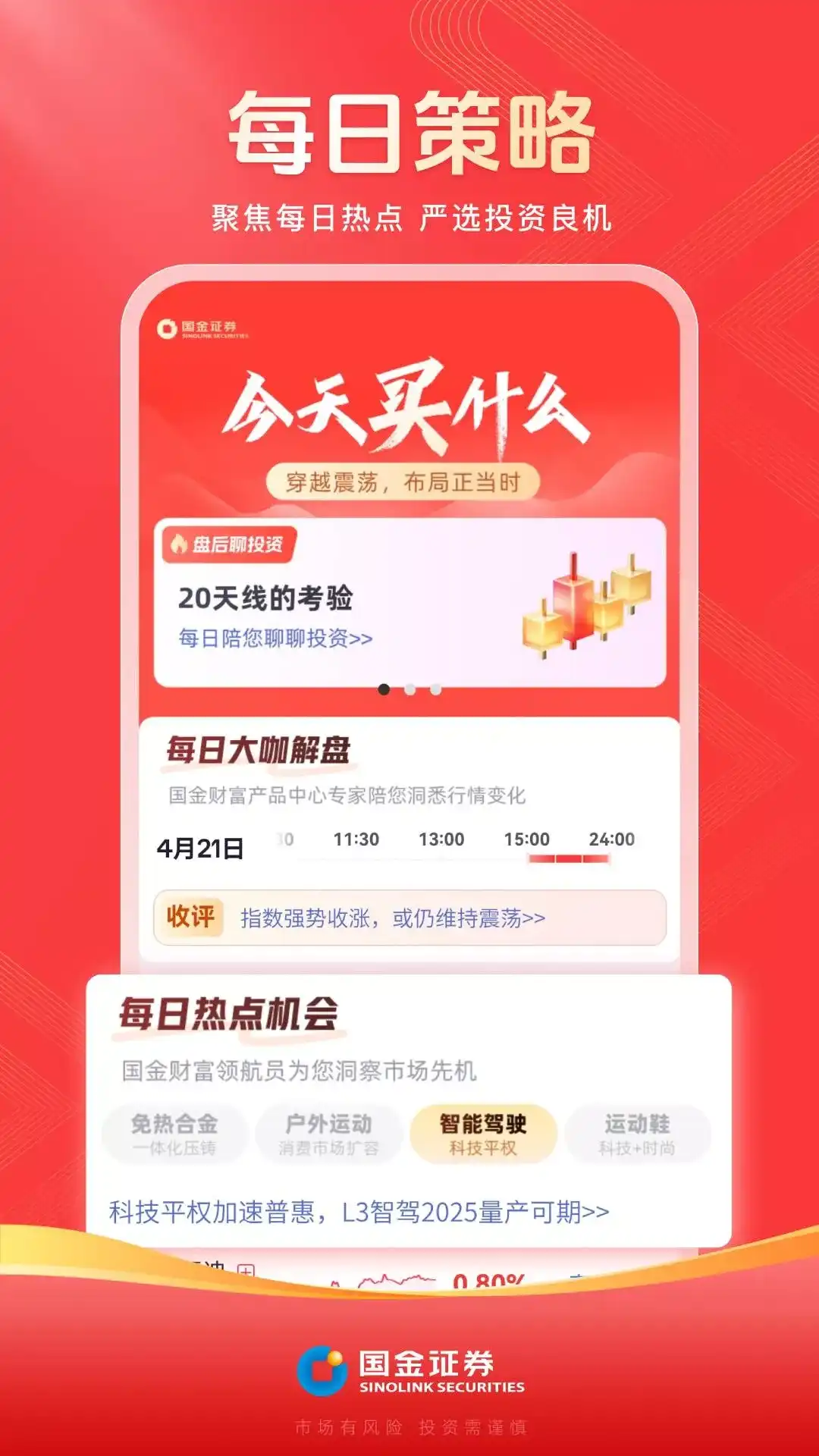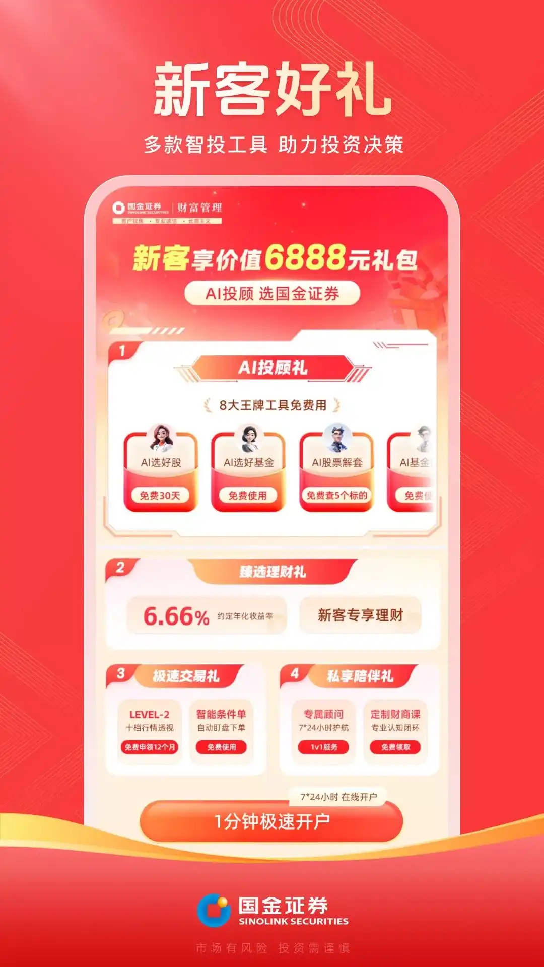 国金佣金宝是国金证券推出的1+1+1证券服务产品,支持7x24小时在线开通股票账户,成功开户后为您提供便捷的证券交易、证券理财、证券投资咨询服务。上线以来,国金证券佣金宝凭借良好的股票交易体验、高品质证券服务功能,赢得投资者的深度认可。“财富管理选国金,服务优质更称心”,已经成为广大用户心中的共识。 特色服务: 1.便捷的股票开户服务:支持7x24小时在线开通沪深A股股票账户,在线开通北交所、港股通、创业板、科创板等证券账户或投资权限 2.账户专属财富管理方案:基于用户账户的风险承受能力,为用户匹配专属的财富管理方案 3.理财产品精准匹配服务:根据市场行情及用户情况,为用户精准能匹配理财产品,快速找到适合自己的理财方式 4.更高品质股票咨询服务:推出决策商城、全职参谋、智投宝、投顾服务工作室等咨询服务,满足各类用户投资需求 5.股票快速交易及行情服务:提供沪深A股B股股票、基金、港股通等交易服务,提供沪深A股、B股、基金、期权、期货、债券、港股、美股等主要金融市场交易行情 6.更丰富的用户互动服务:提供7x24小时智能客服、模拟炒股、ETF基金大赛、国金积分、国金财富号等互动服务和活动