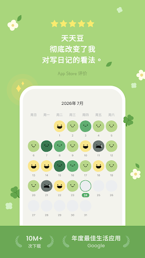 想轻松留下每一天的人们而开发的简单的日记APP, 在天天豆通过标签来记录一下我的每一天吧。<br><br><b>天天豆正在提供以下功能。</b><br><br><font color="#61AE72"><b>○ 一眼就能看出我心情的月历</b></font><br><br>通过五种颜色和表情豆,确认一下我一个月的心情吧。点击豆豆后,可以立即确认当天所记录的内容。<br><br><font color="#61AE72"><b>○ 通过心情豆和活动图标,可以简单地记录一天</b></font><br><br>用心情豆选择我今天一天的心情后,再通过五颜六色的图标来概括一下今天一天吧。还可以添加一张图片和一行留言哦。<br><br><font color="#61AE72"><b>○可以选择我喜欢的类别的记录模块</b></font><br><br>可以随时添加或删除模块,并且会不断地更新类别。<br><br><font color="#61AE72"><b>○ 以周/月为单位分析心情和活动的统计</b></font><br><br>通过统计来观察我的心情流动,并确认一下对我的心情带来影响的活动是什么。以周和月为单位,也可以确认每项活动的记录次数。<br><br>使用APP时,如有疑问或不便之处,请随时联系我们!<br><br>邮箱: dailybean@bluesignum.com<br>Instagram: https://www.instagram.com/dailybean_official/