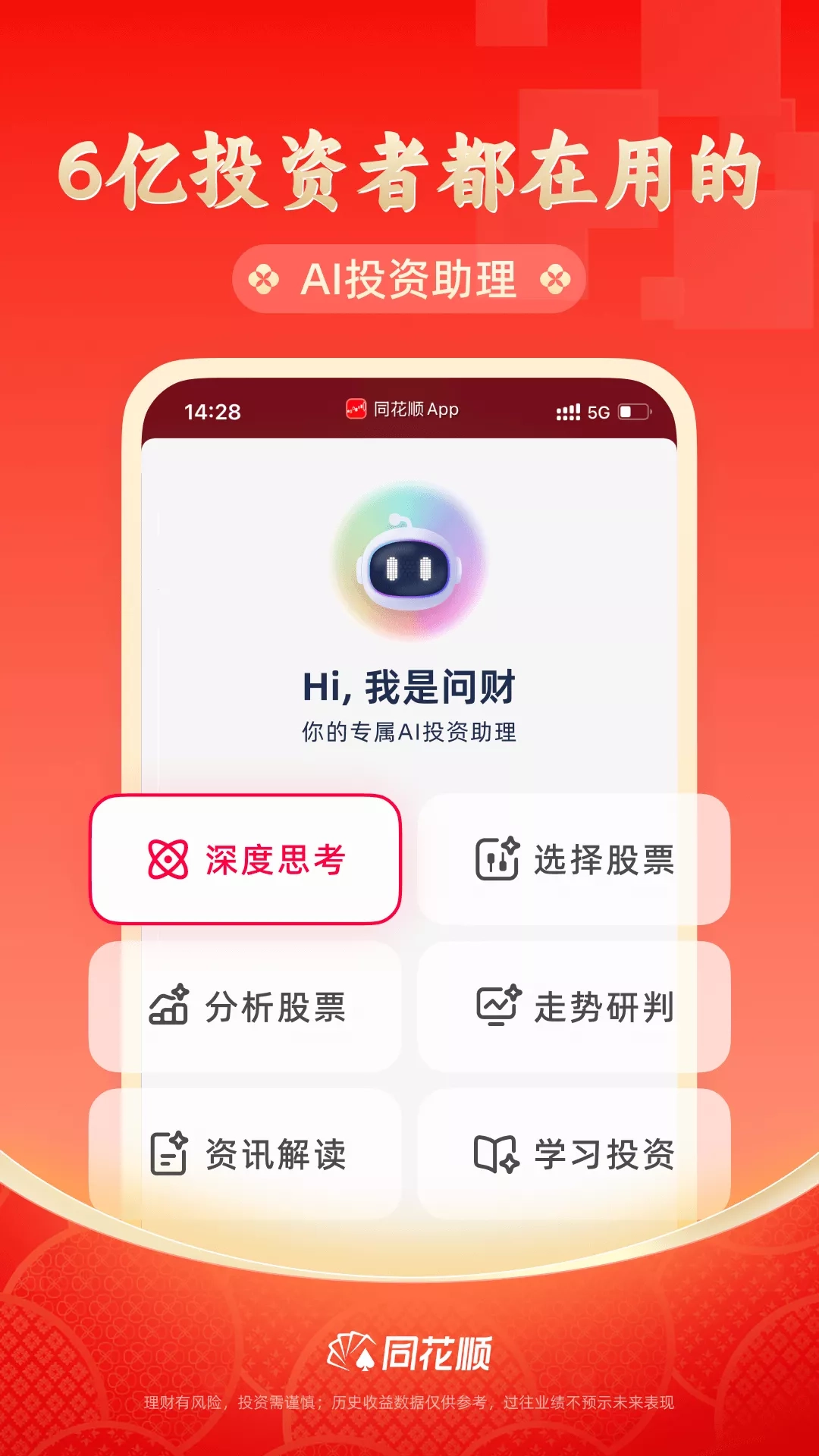 同花顺(300033),幸得您一路相伴! 同花顺 股票 炒股软件提供专业的免费实时行情,极速交易;全面金融数据,智能投资服务,沪深港美股全球行情,低佣券商开户交易,基金银行理财,融资融券,全面一站式理财服务,广大投资者的选择。 [炒股必备] 神奇九转:发现股价拐点,轻松做T 智能盯盘:盘面异动,涨跌统计,主力动向,机构观点,大事提醒,股价预警,市场尽在掌控 自选分组:多平台云同步,自选股轻松分组,自选股详细数据一目了然 筹码分布:有效识别主力建仓和派发过程,轻松找到支撑位、阻力位 问财选股:主题投资,形态选股,龙虎榜,技术指标等各种丰富选股,轻松智选个股 专属资讯:个性化资讯推荐,实时快讯,机会情报,抓紧先机 模拟炒股:免费20万资金,轻松成为高手 闪电下单:支持全国众多券商在线交易,分时快买快卖,投资下单快人一步 老牌炒股软件同花顺,凭借多年为千万股民服务经验及股民口口相传,在各色炒股、理财、投资软件中脱颖而出,是股民一致选择! 客服热线:952555 软件内直接反馈:个人中心-帮助与反馈-提建议